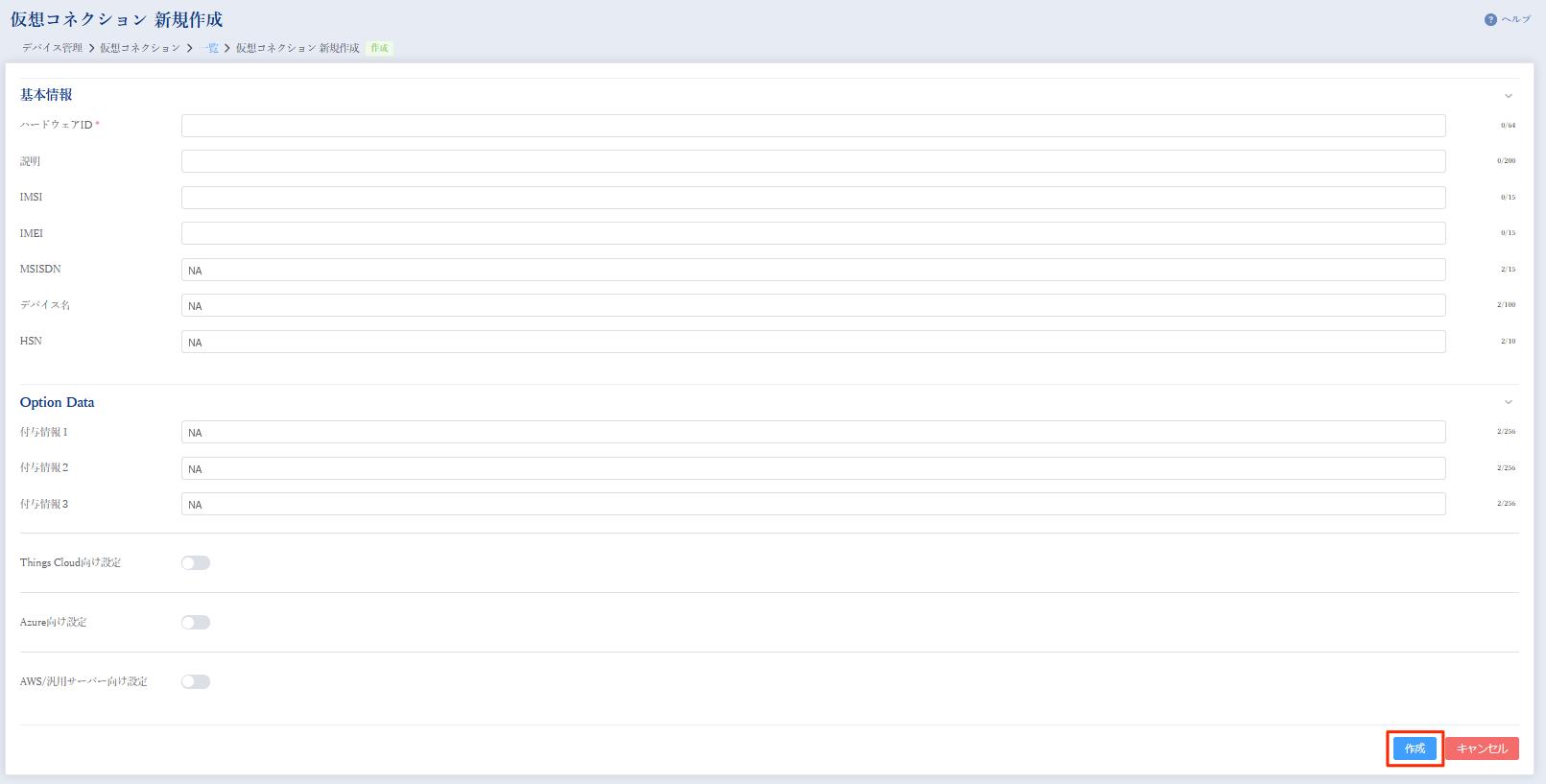以下のような新規作成画面が表示されます。必要な情報の設定が終わりましたら、「作成」ボタンをクリックします。