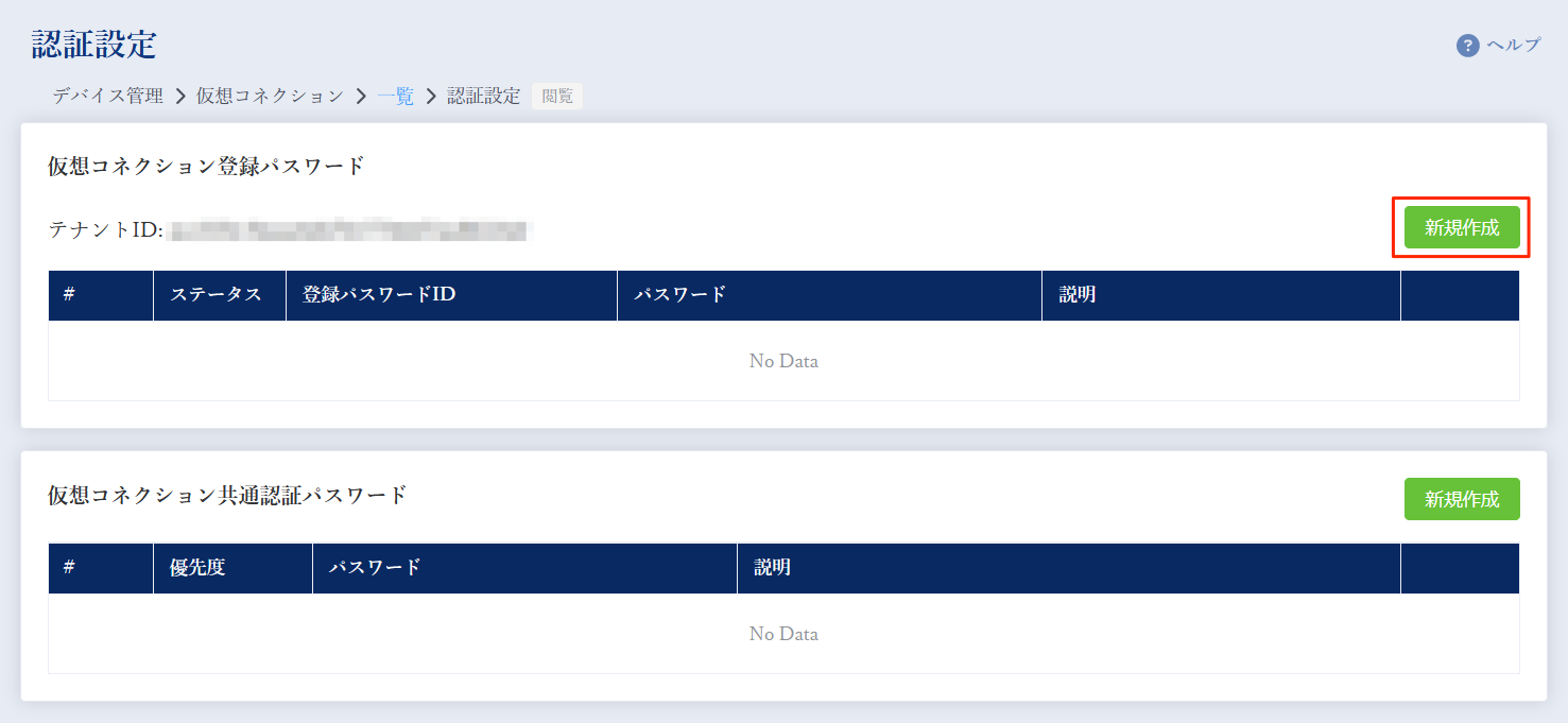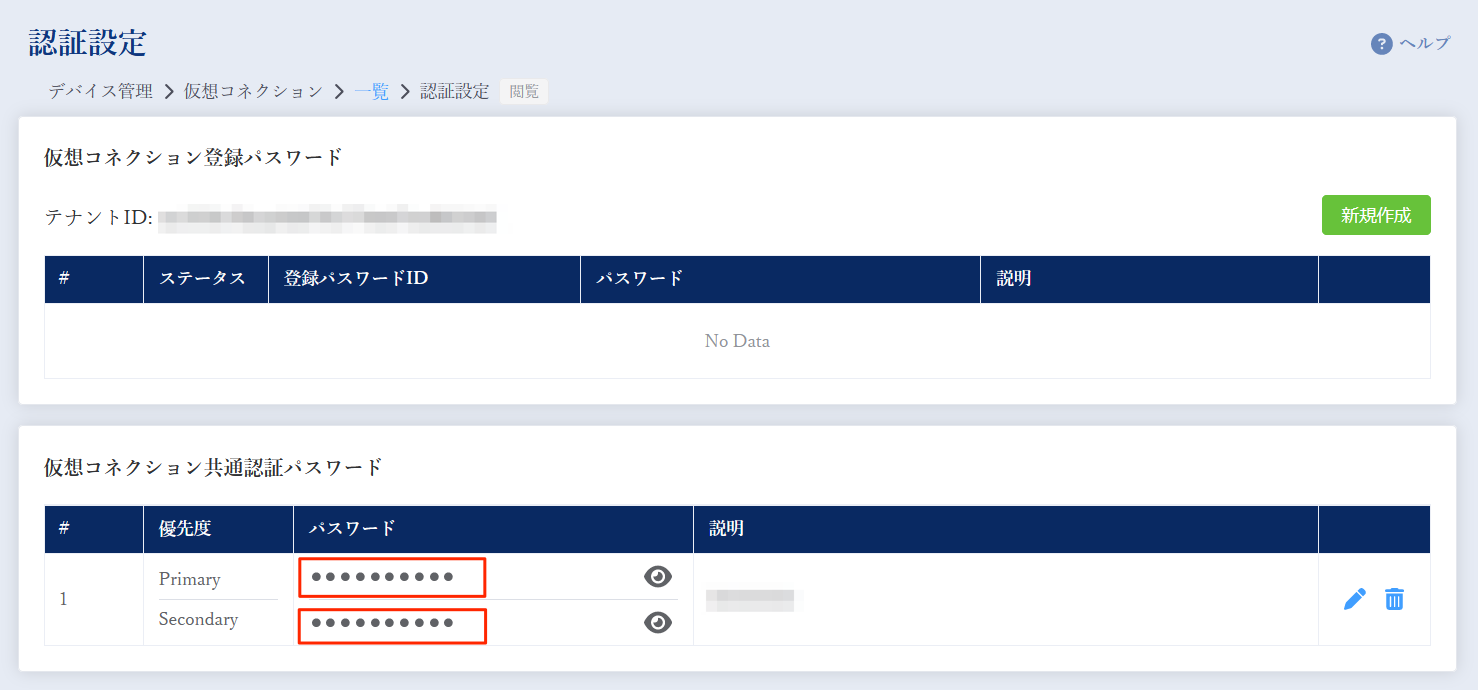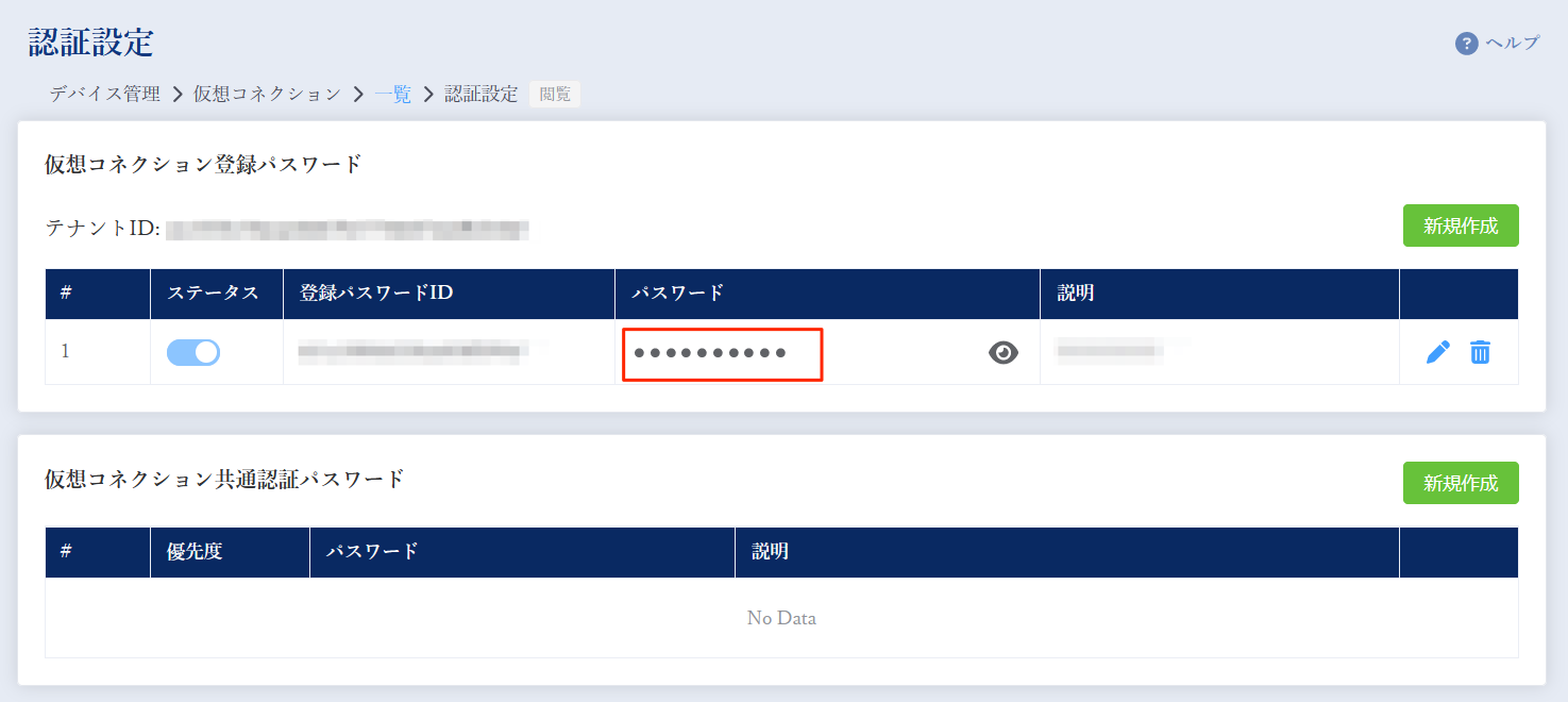 設定した仮想コネクション登録パスワードが表示されます。デバイス登録用のリクエストを送信する際は、画面赤枠内の認証情報をご利用下さい。