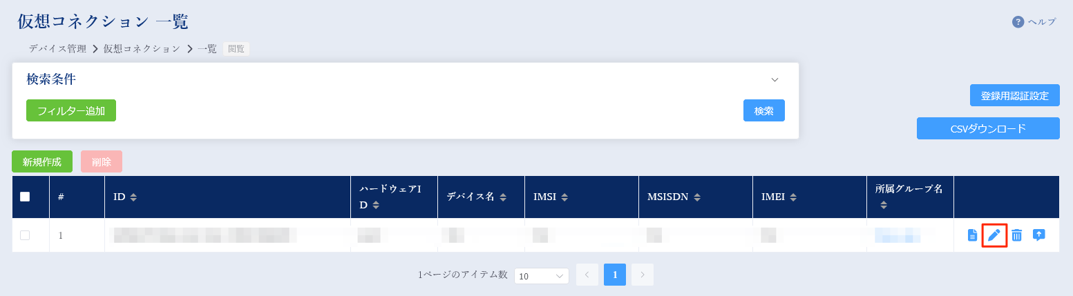 作成した仮想コネクションが表示されます。画面赤枠の鉛筆アイコンをクリックします。
