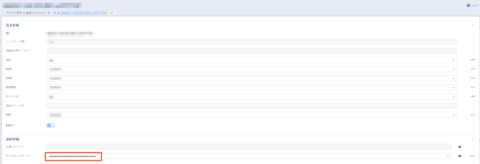 仮想コネクションでリクエストを送信する際は、画面赤枠内の認証情報をご利用下さい。デバイスパスワードは仮想コネクション登録後、自動生成されますが、任意のパスワードに変更することも出来ます。
