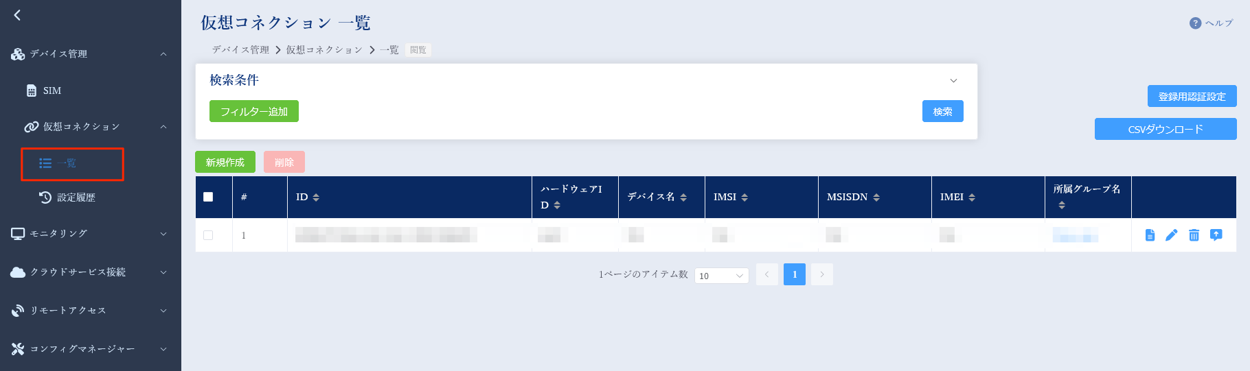 左側のメニューから、「 仮想コネクション 」 > 「一覧」をクリックすると、登録した仮想コネクションが表示されます。