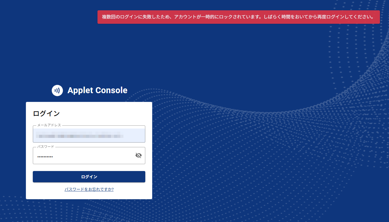 ロック中は「複数回のログインに失敗したため、アカウントが一時的にロックされています。しばらく時間をおいてから再度ログインしてください。」というメッセージが表示されます。