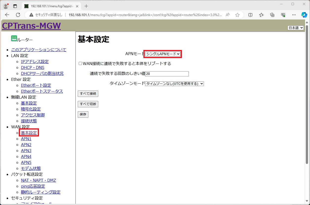 [基本設定] ページで [APNモード] が [シングルAPNモード] に設定されていることを確認します。