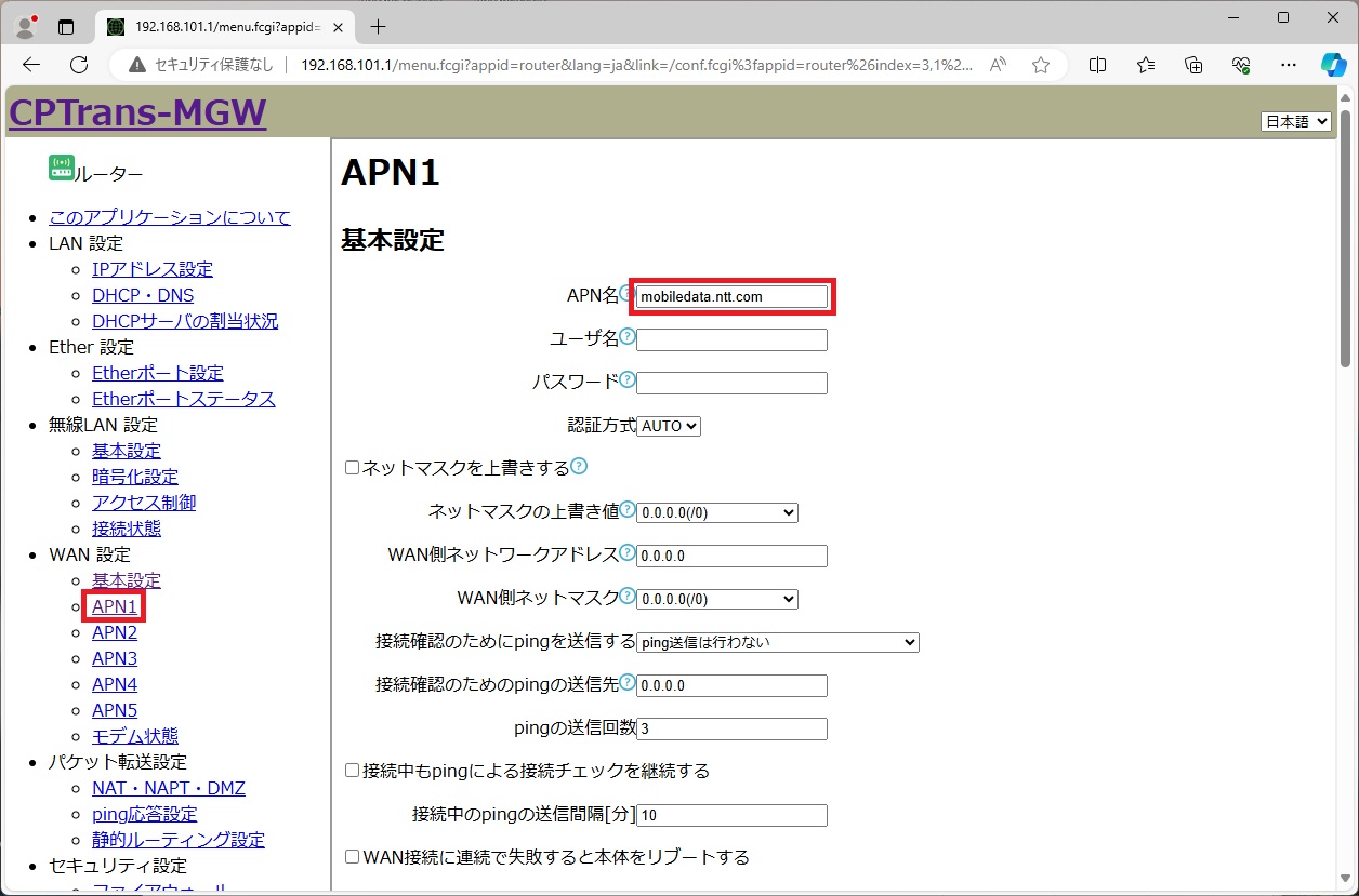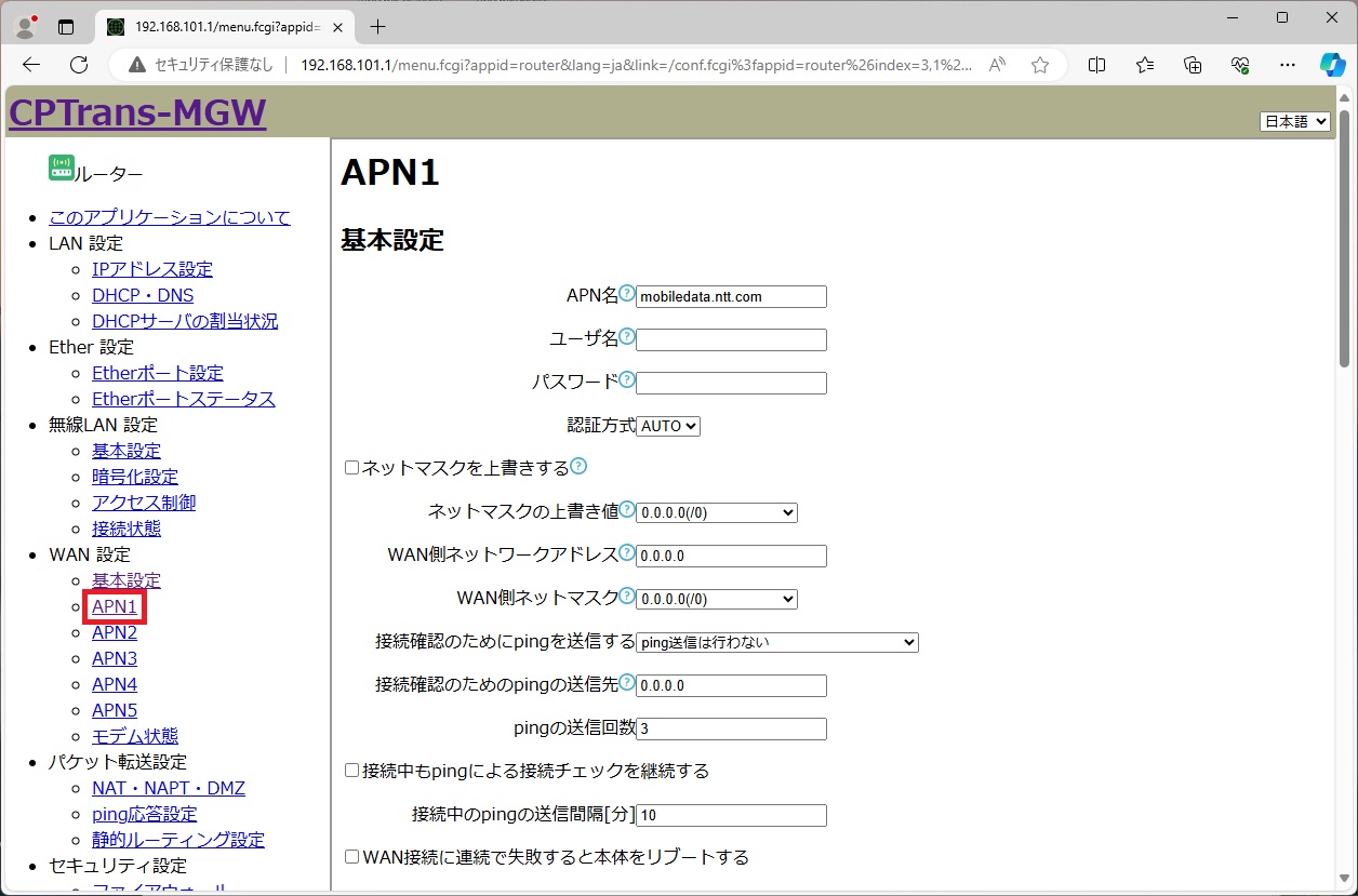 [ルーター] ページの左ペインの [WAN設定] - [APN1] をクリックし、 [APN1] ページを表示します。