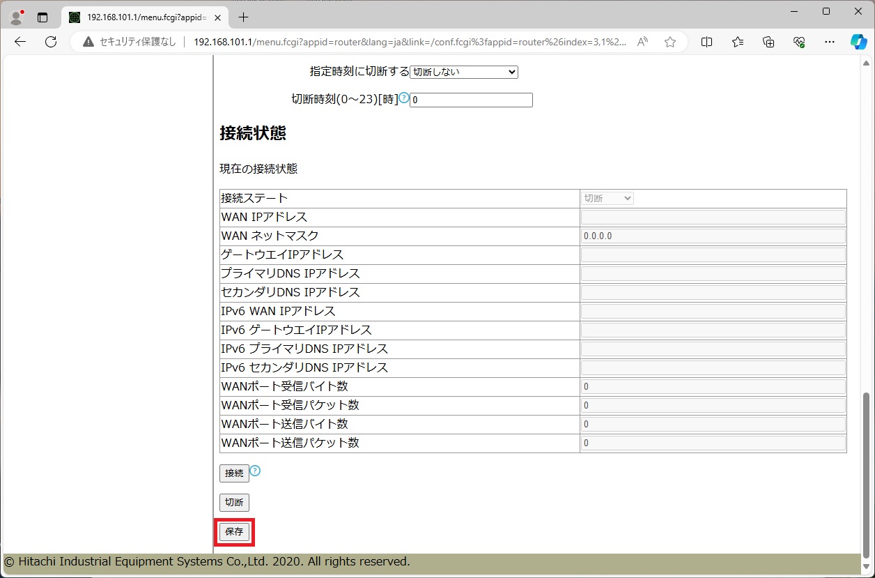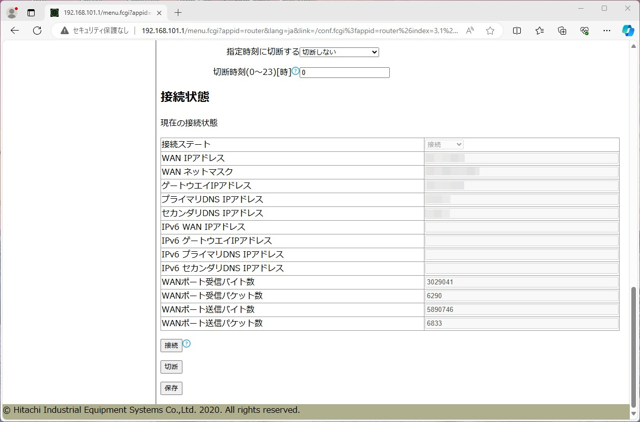 [APN1] ページを下方向にスクロールし、 [接続状態] を表示します。 [接続状態] では、IPアドレス情報や、送信・受信データ量(バイト数、パケット数)などの情報が確認できます。