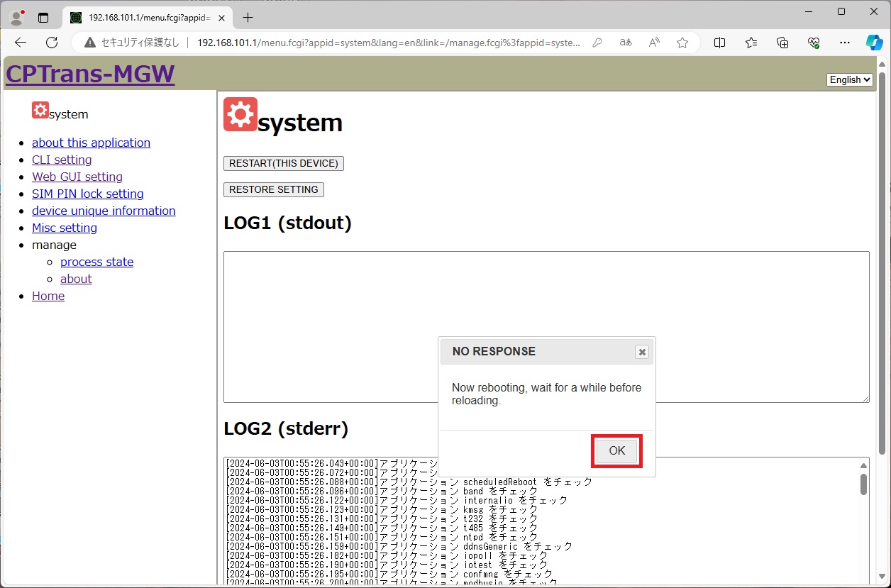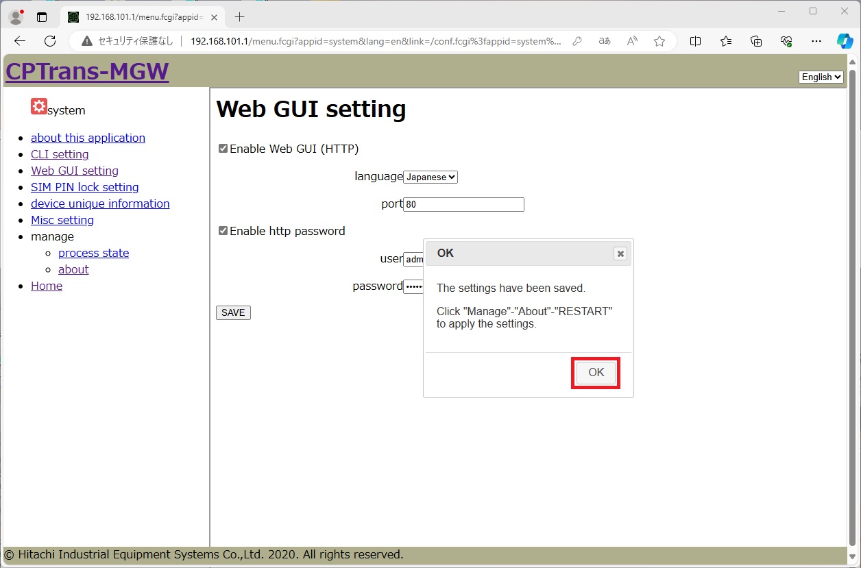 しばらく待って、再度Web GUIページに再接続します。