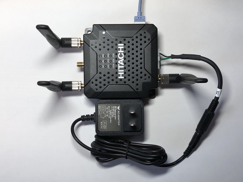 本体にACアダプタ、アンテナ、LANケーブルを本体に接続します。また、LANケーブルのもう一方は、DHCPにてIPアドレスが自動割り当てされるように設定した 設定用PC を接続します。