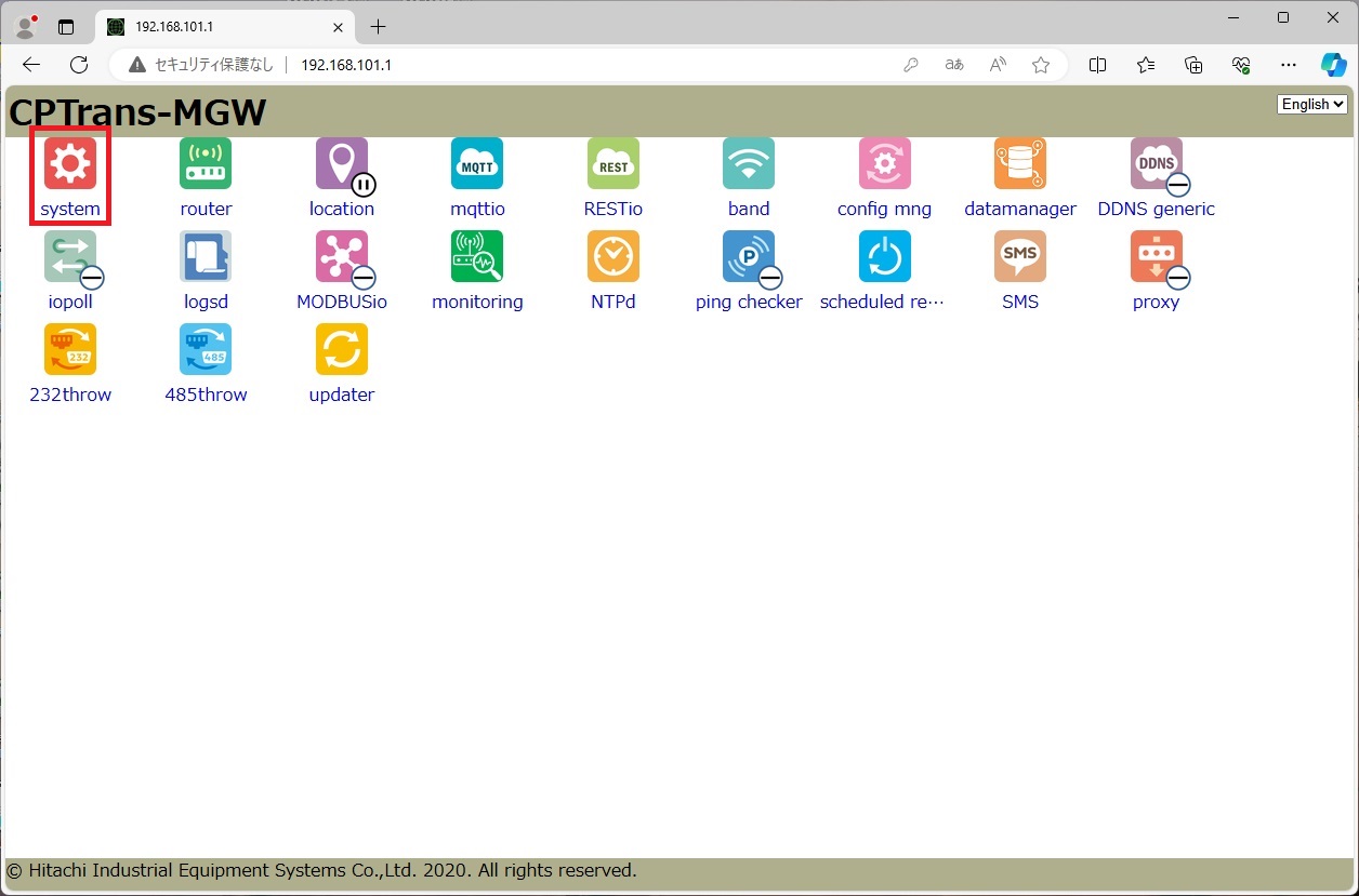 初期ページの [system] アイコンをクリックし、 [system] ページを表示します。