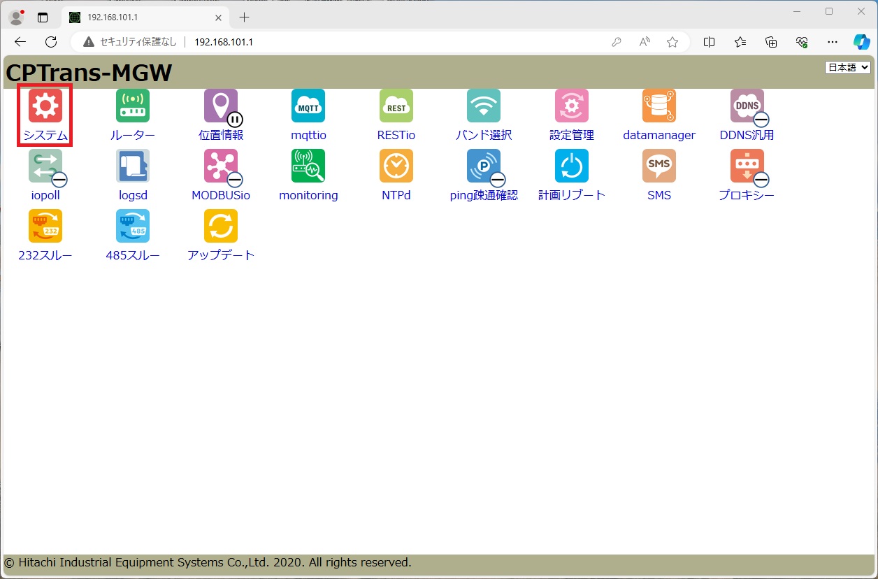 初期ページの [システム] アイコンをクリックし、 [システム] ページを表示します。