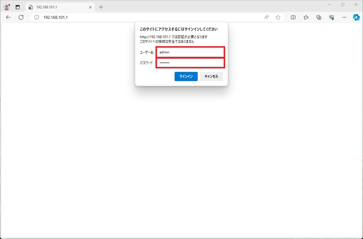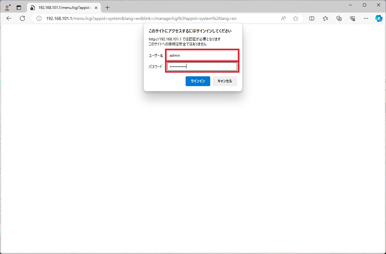 本体が起動したら、設定用PCのWebブラウザに以下のURLに入力し、Web GUIに接続します。アクセスが成功するとログインダイアログが表示されます。ログインダイアログにて以下の [ユーザー名] 、 [パスワード] を入力し、ログインします。