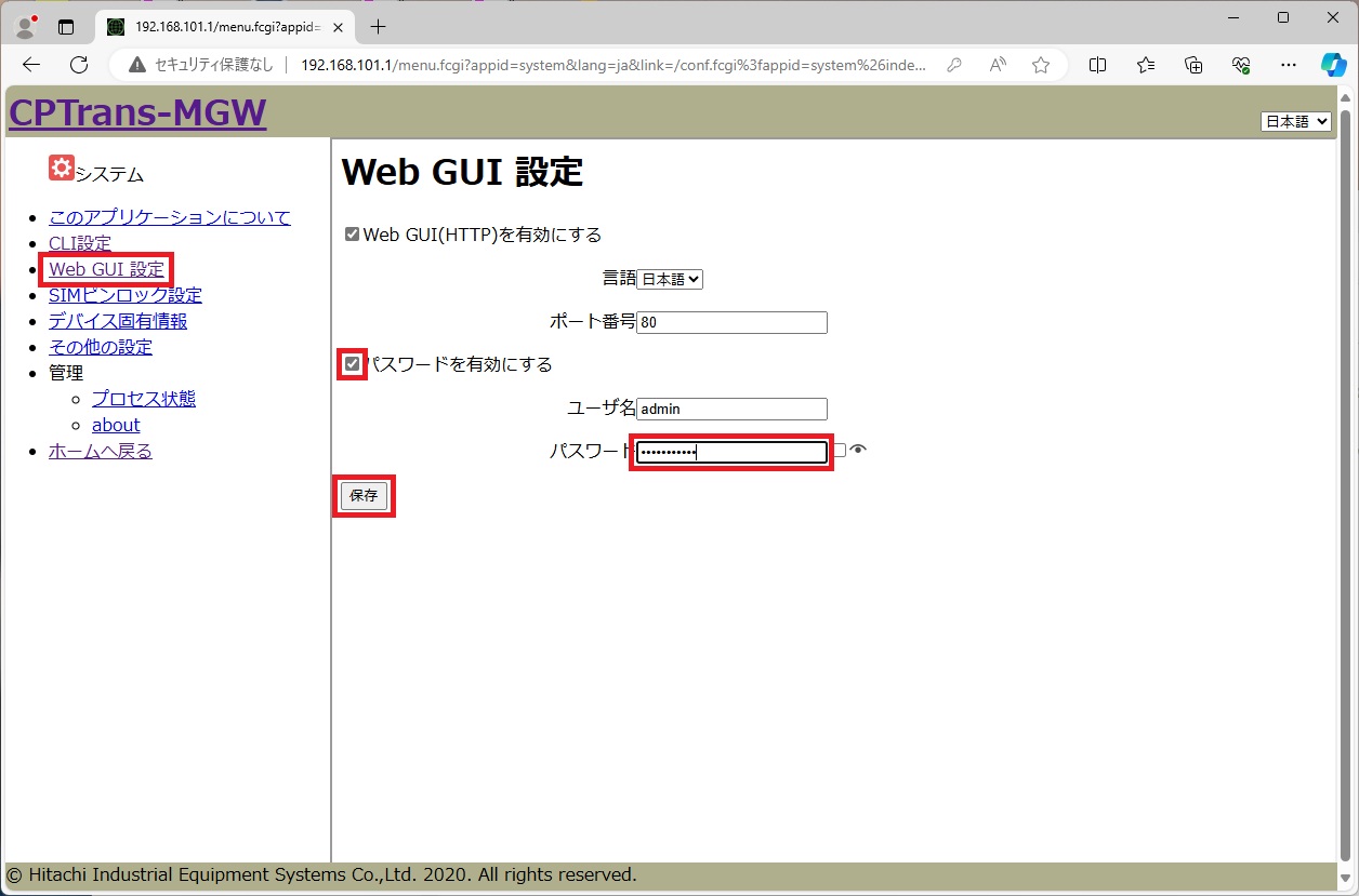 - Web GUIパスワードを設定します。
