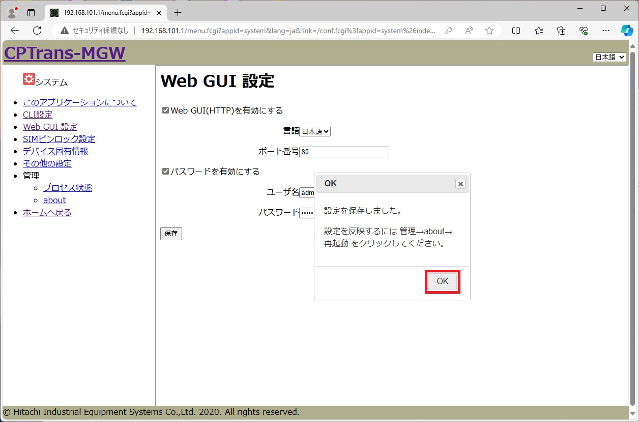 ページの再読み込みだけでは、変更が反映されない場合があります。Webブラウザの新たなページからWeb GUIにアクセスしてください。