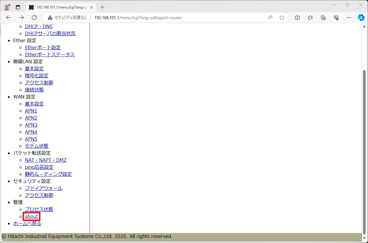 [ルーター] ページの左ペインの [管理] - [about] をクリックし、 [ルーター] ページを表示します。