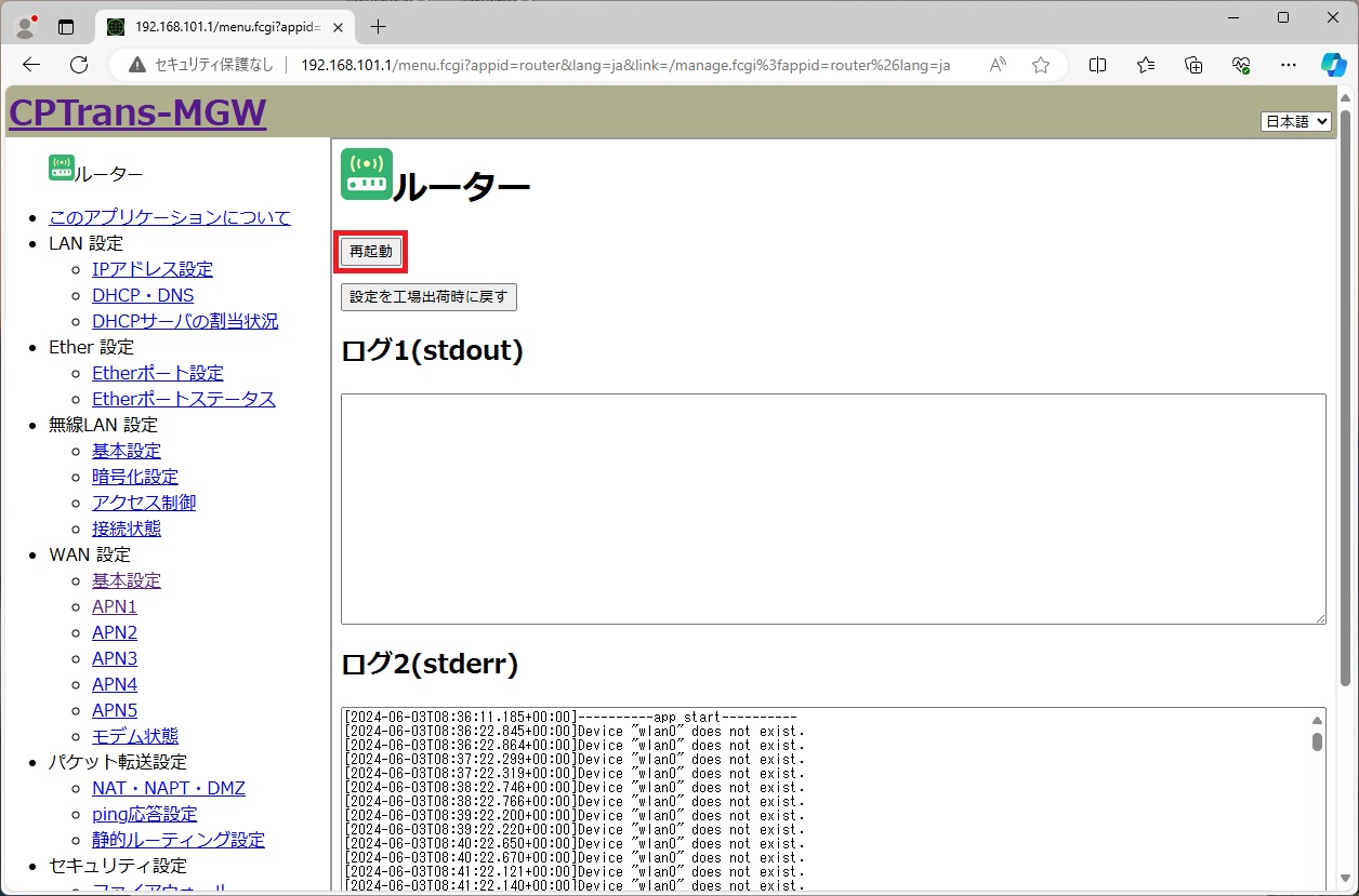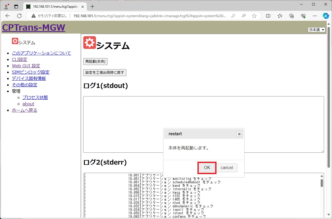 [再起動(本体)] ボタンをクリックし、再起動します。