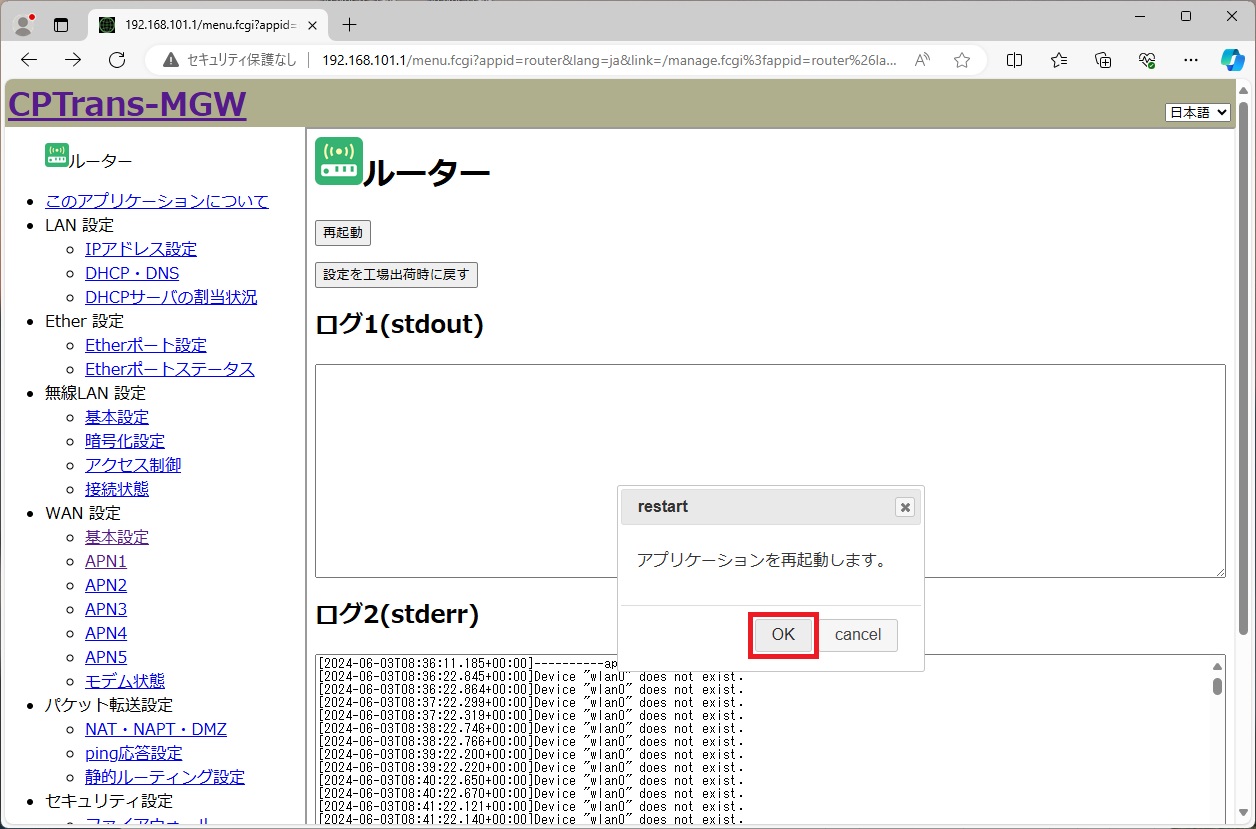 - APN設定を反映させるため、再起動します。