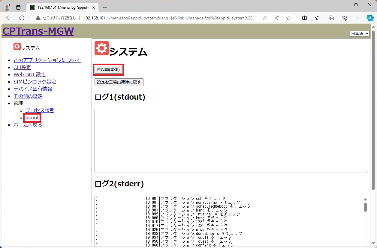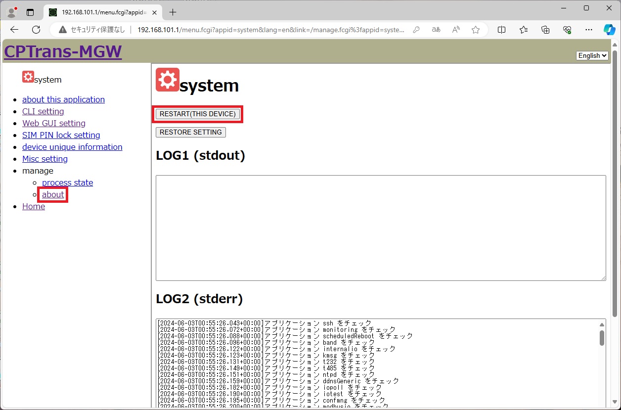 [system] ページから [manage] - [about] をクリックし、 [system] ページを表示します。