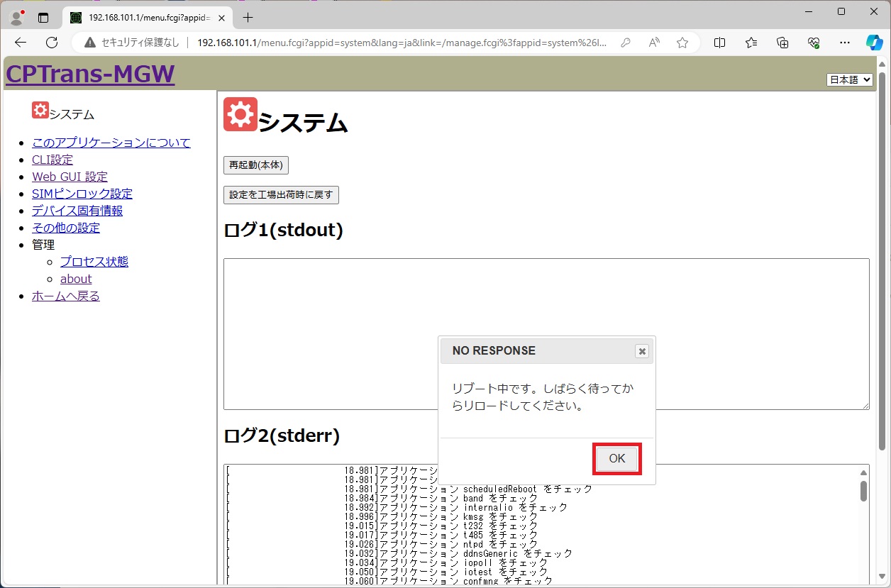 [NO RESPONSE] ダイアログが表示されますので、 [OK] をクリックします。