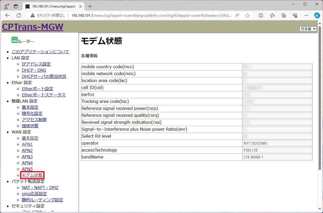 - 設定が正しければ、モバイル通信が確立します。ネットワークの情報は、Web GUIから確認できます。