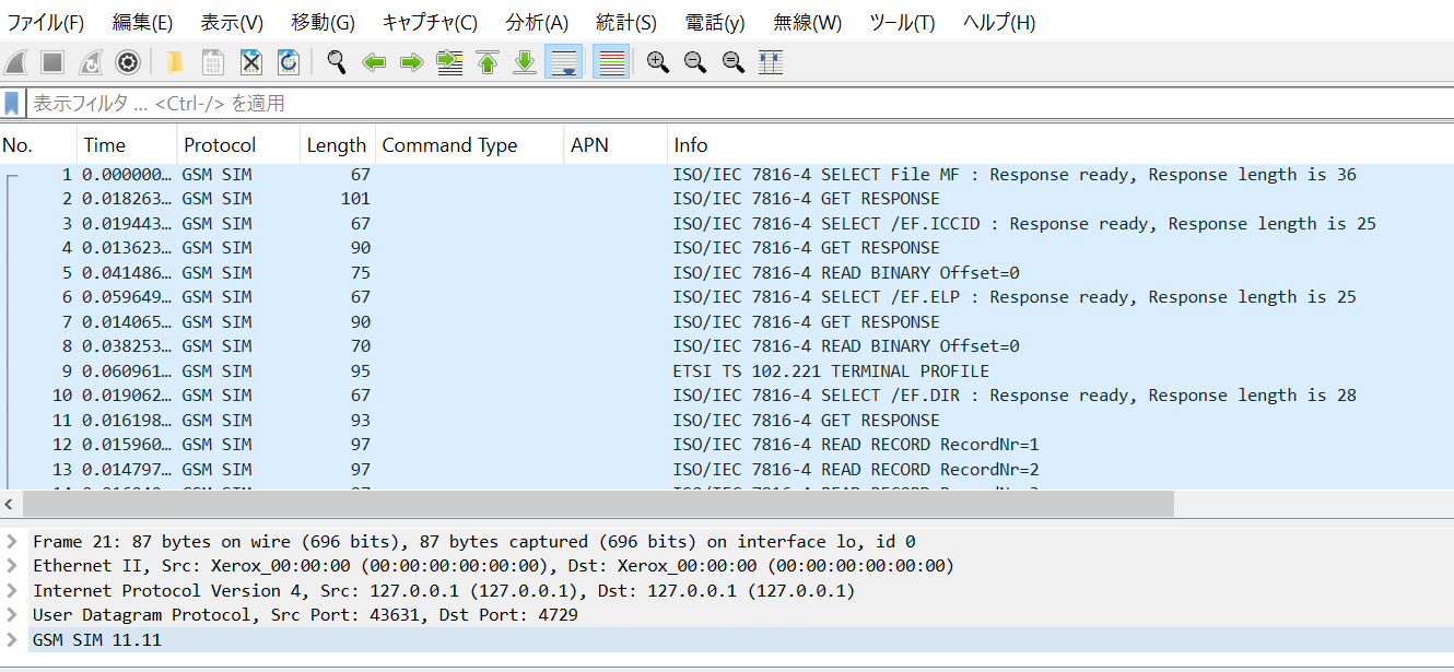 Wiresharkからコンソール出力されるため、 simtrace2-sniff コマンドを実行したコンソールとは別のコンソールから起動することをお勧めします。