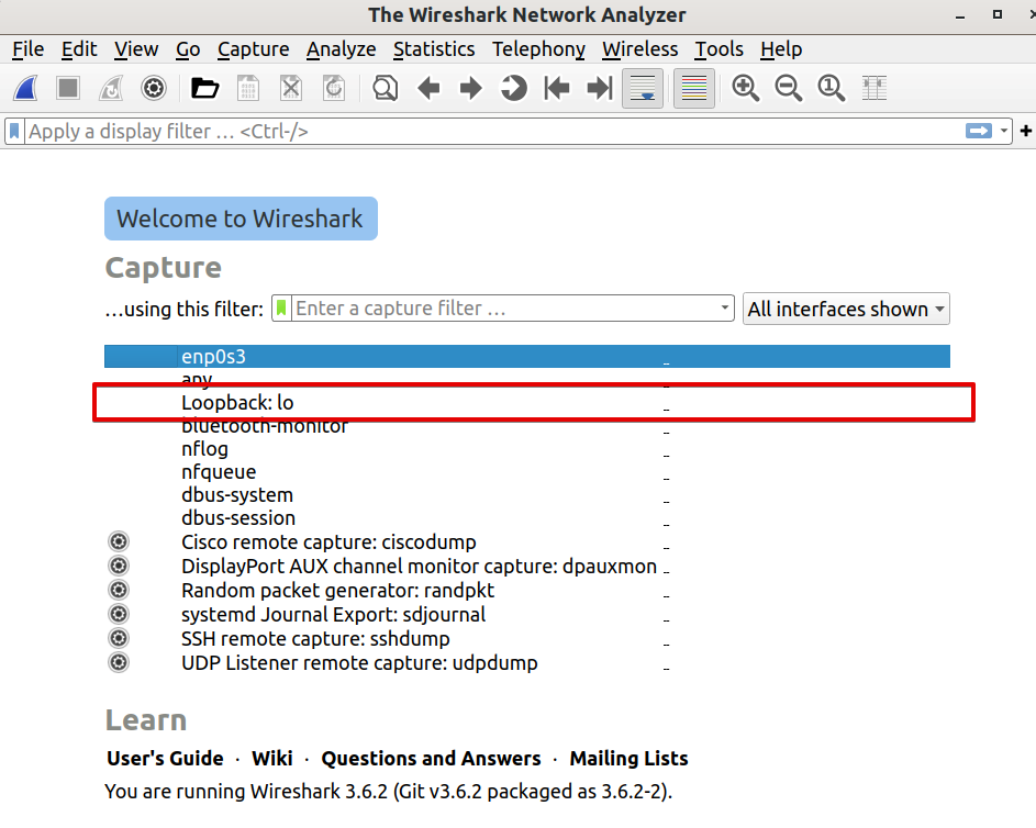 - キャプチャインタフェースとして Loopback: lo を選択します。