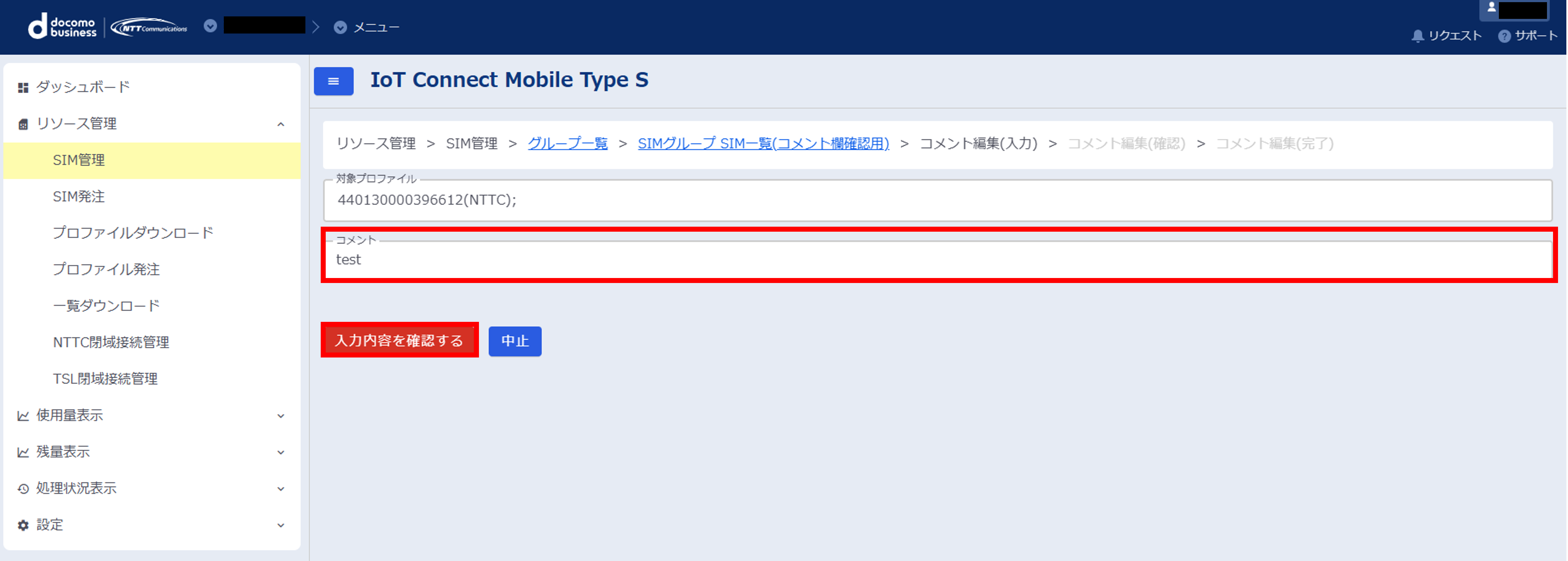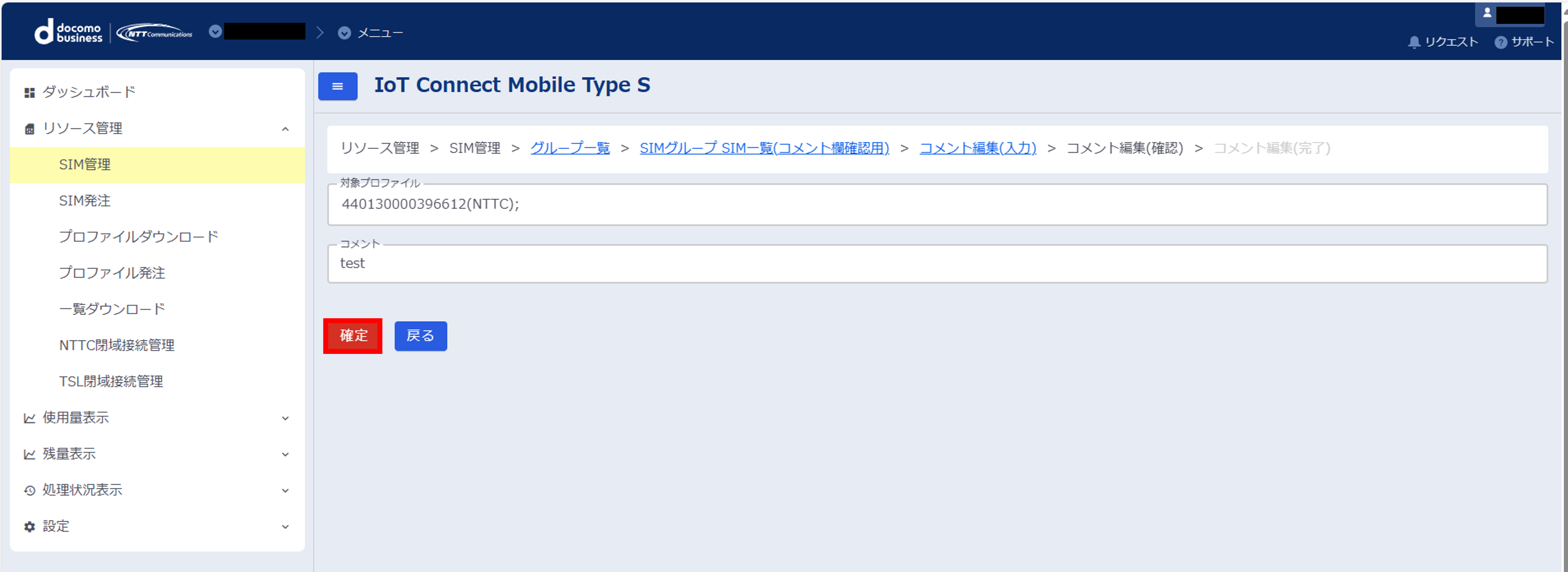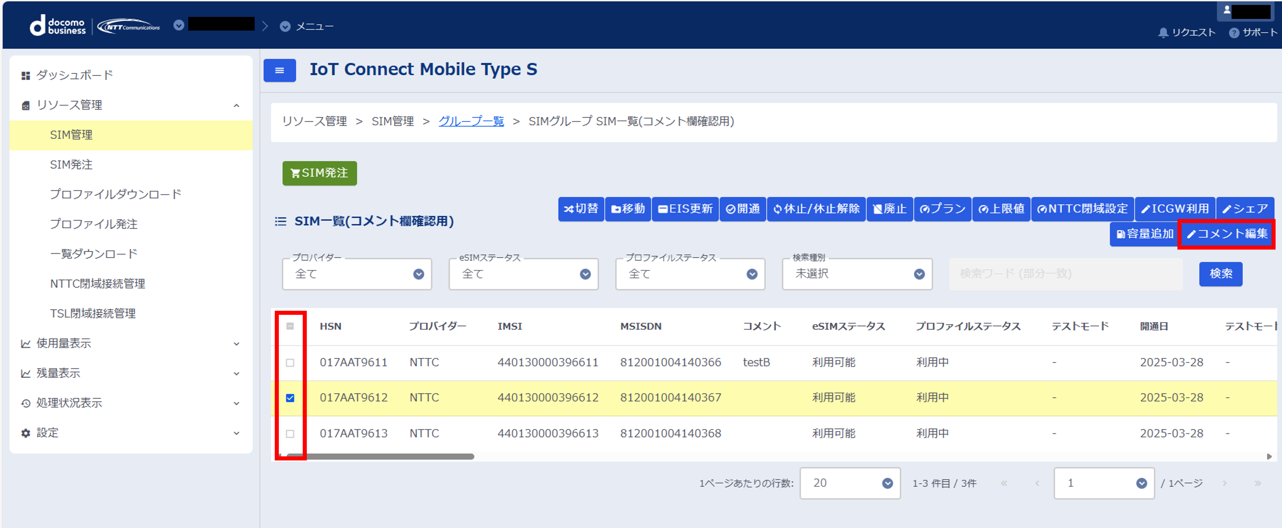 (3)該当のグループ名をクリックし、SIM一覧の中からコメント編集したいプロファイルのチェックボックスにチェックを入れ(複数選択可)、コメント編集のボタンをクリックします。