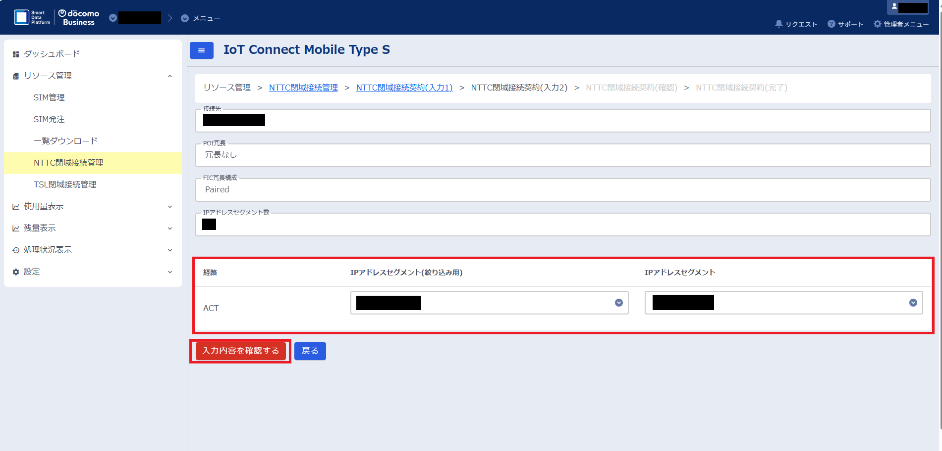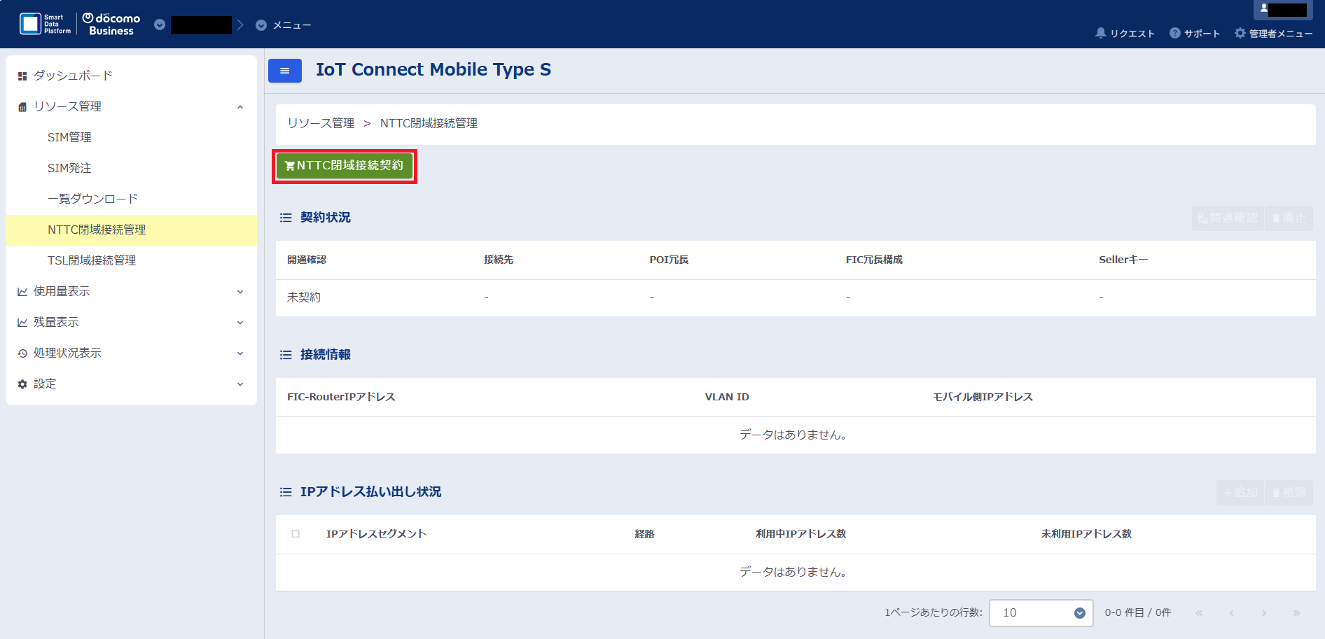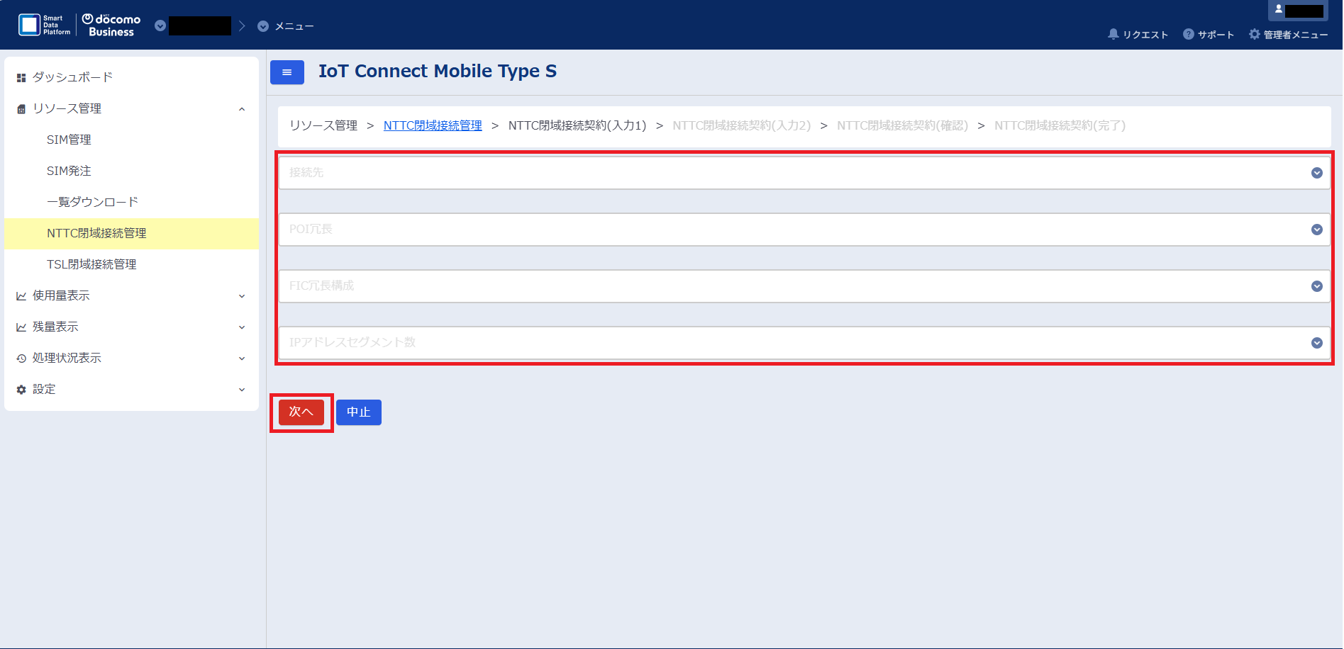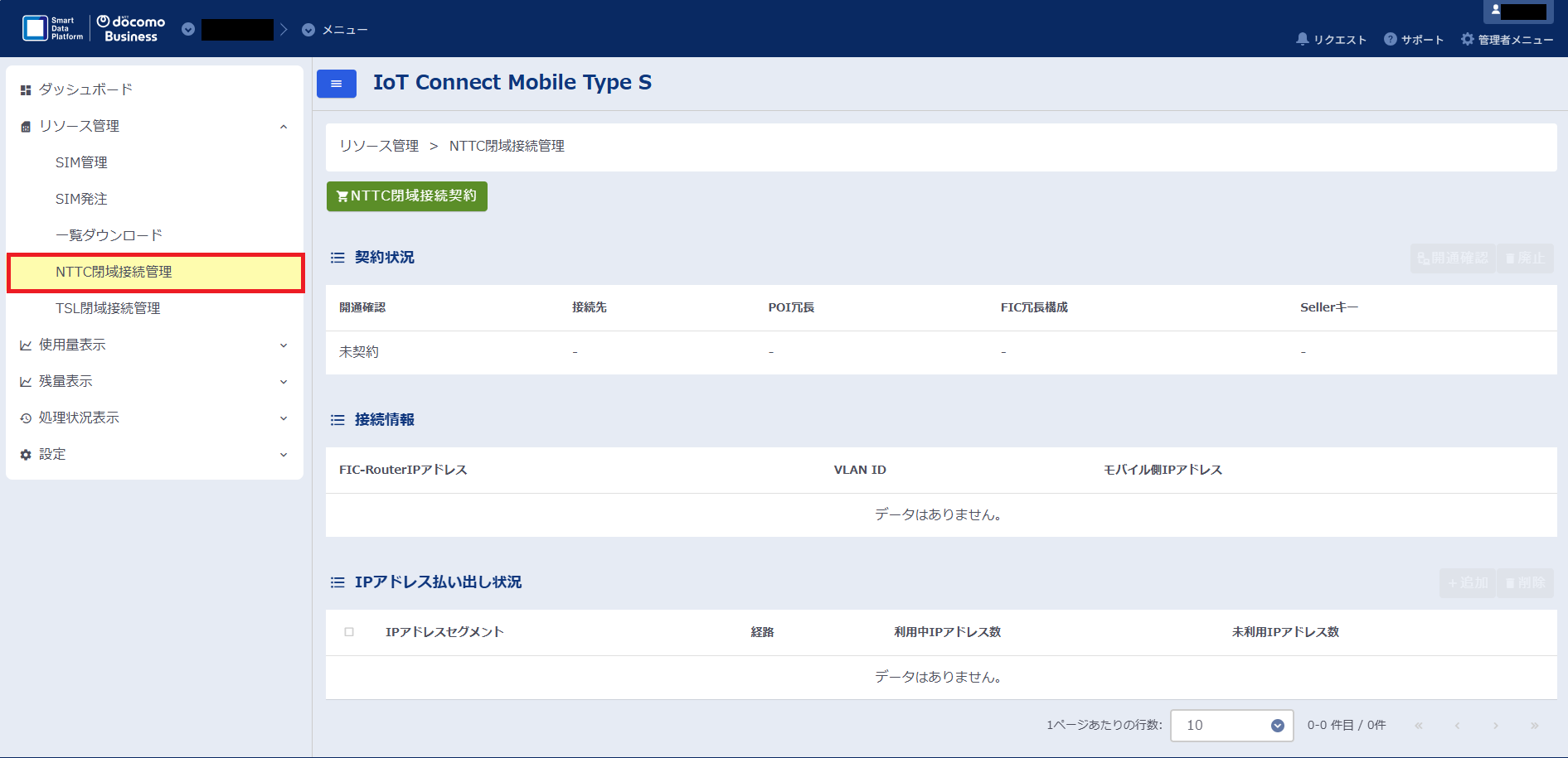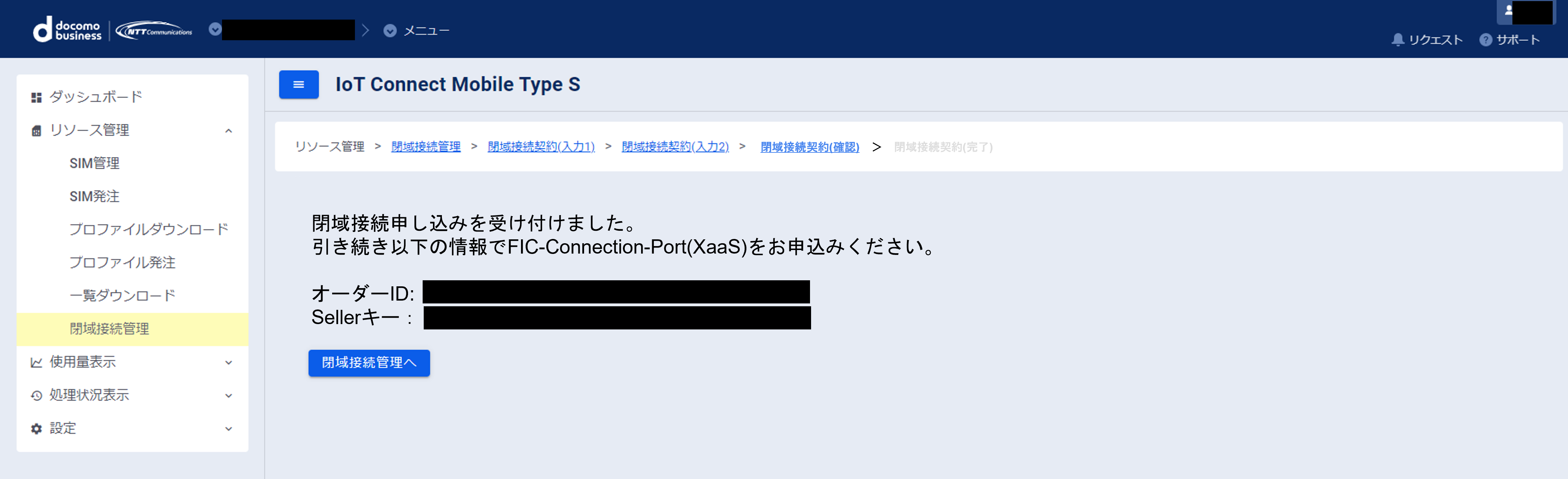 IoT Connect Mobile TypeSコンソール(以下ICM(S)コンソール)にてNTTC閉域接続を申し込みます。