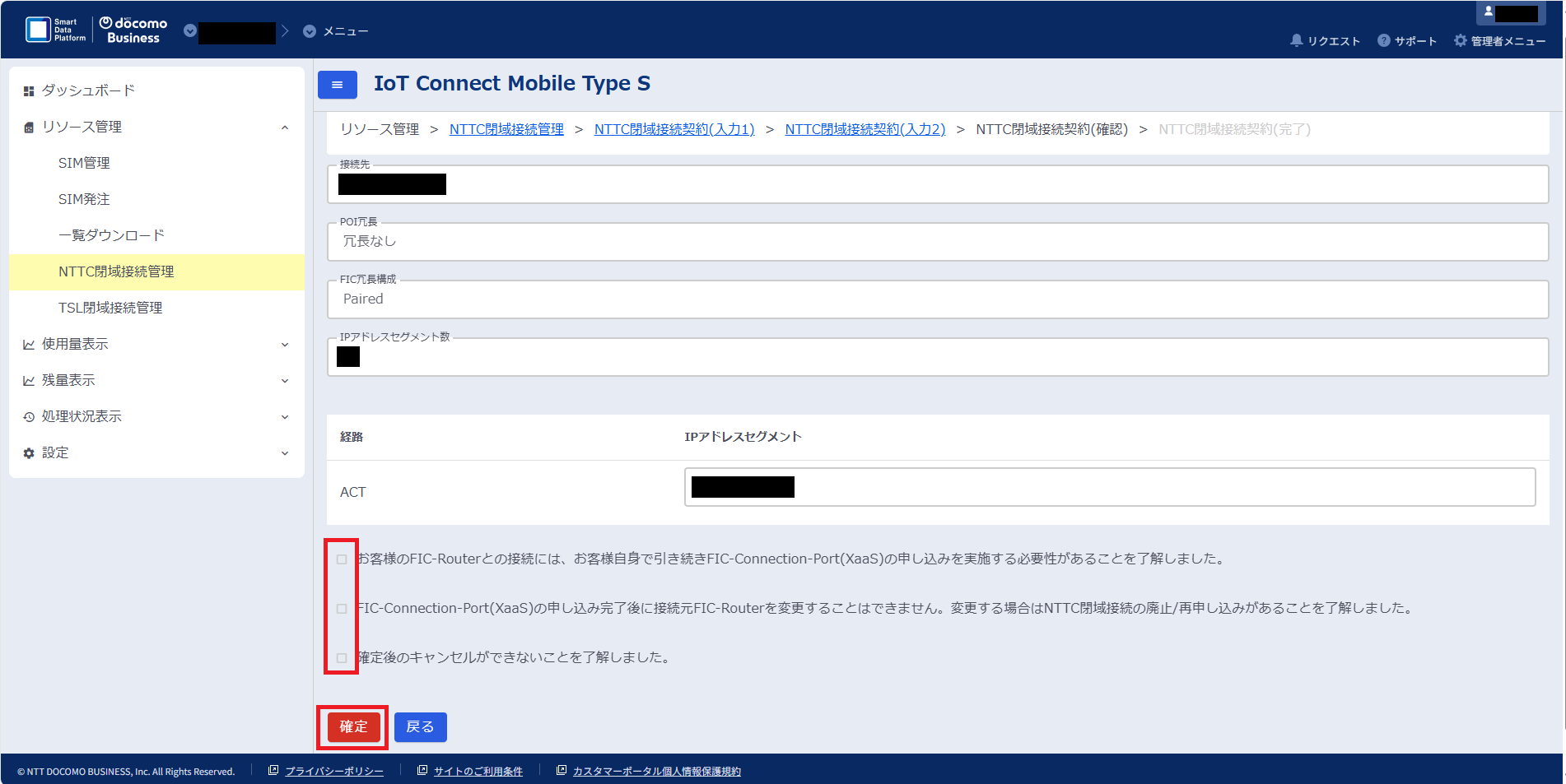 (6)NTTC閉域接続契約(確認)の画面に遷移したら、チェックボックス項目の内容をご確認後、チェックを入れて「確定」をクリックすると申し込みが完了します。