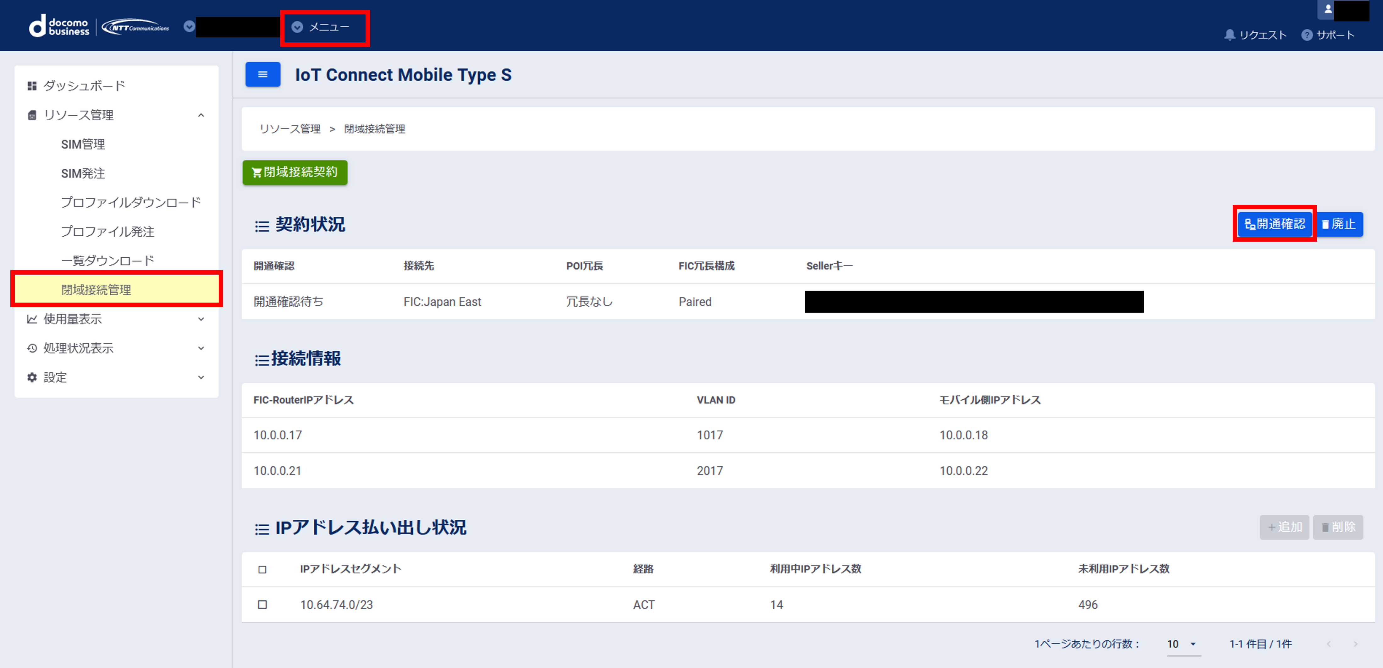 (10) メニューを押下し、Flexible InterConnectコンソールからIoT Connect Mobile TypeSコンソール(以下ICM(S)コンソール)に切り替えます。 下図のようにICM(S)コンソールが表示されますので、リソース管理>閉域接続管理のメニューを選択します。画面右側にある開通確認ボタンを押下すると開通確認が可能です。