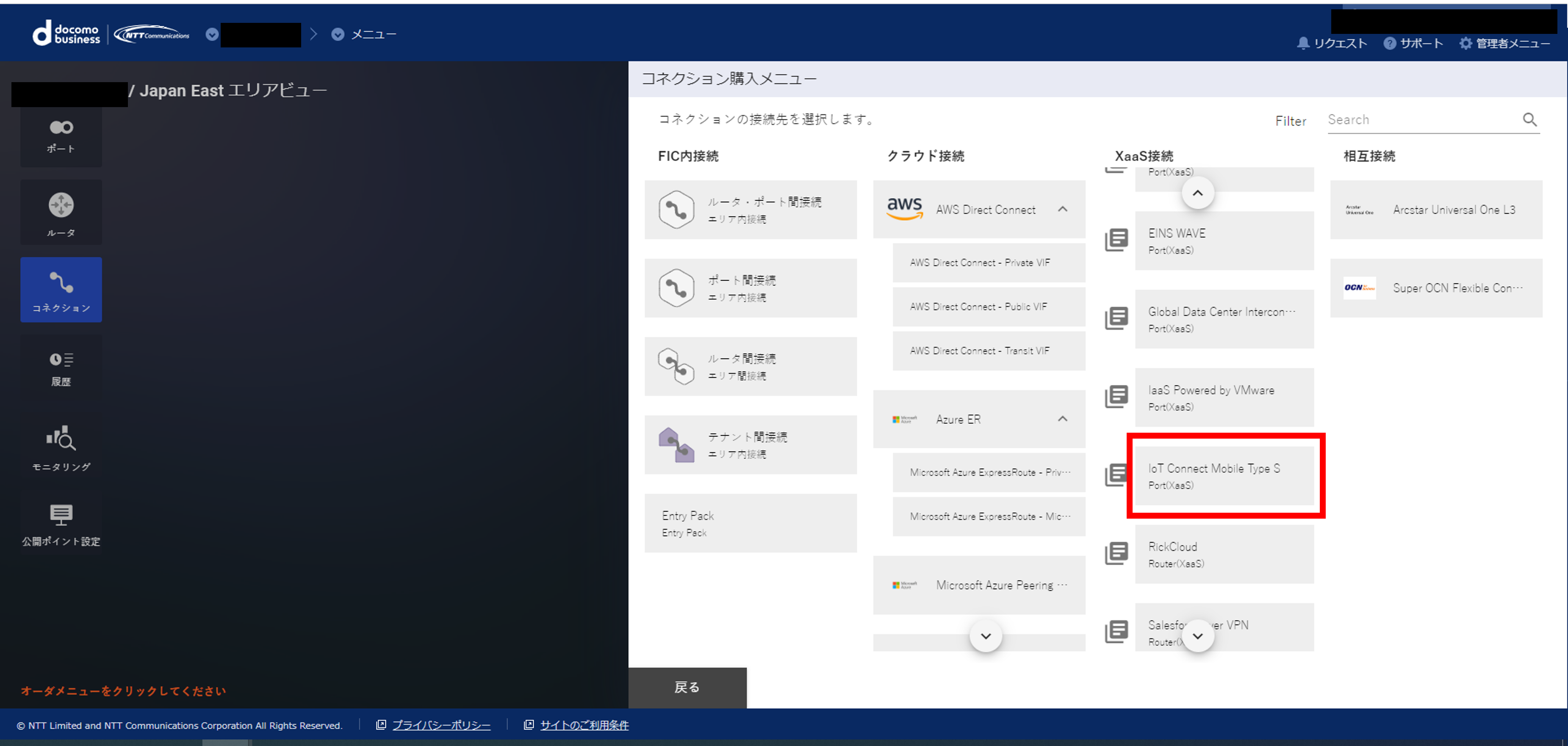 (4)コネクション購入メニュー画面が表示されますので、「XaaS接続」の列からIoT Connect Mobile Type S を選択してください (右上の 「Filter」 にて公開サービスの検索が可能です)。