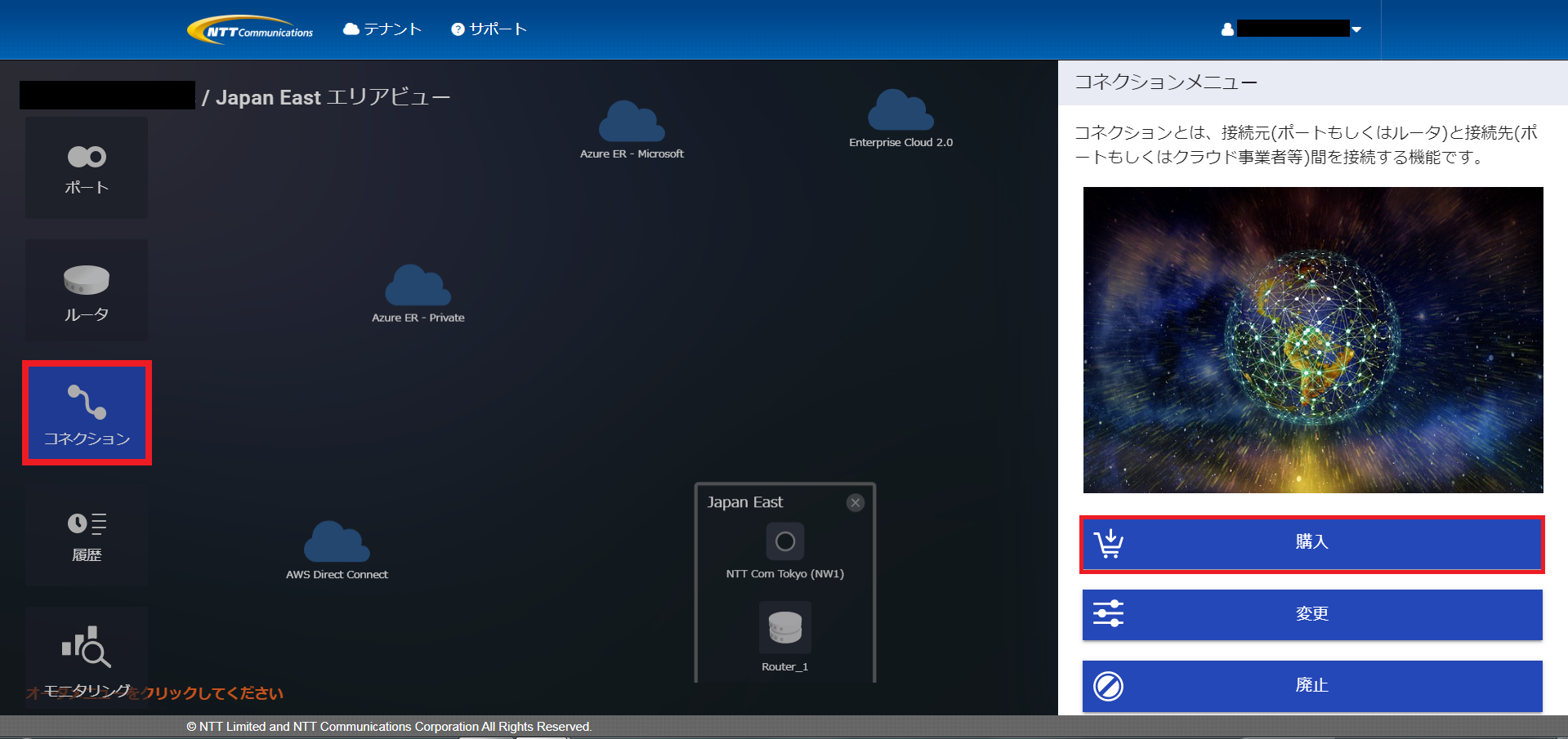 (3)左メニューから「コネクション」を押下しますと、画面右側にメニューが表示されますので、「購入」を押下します。