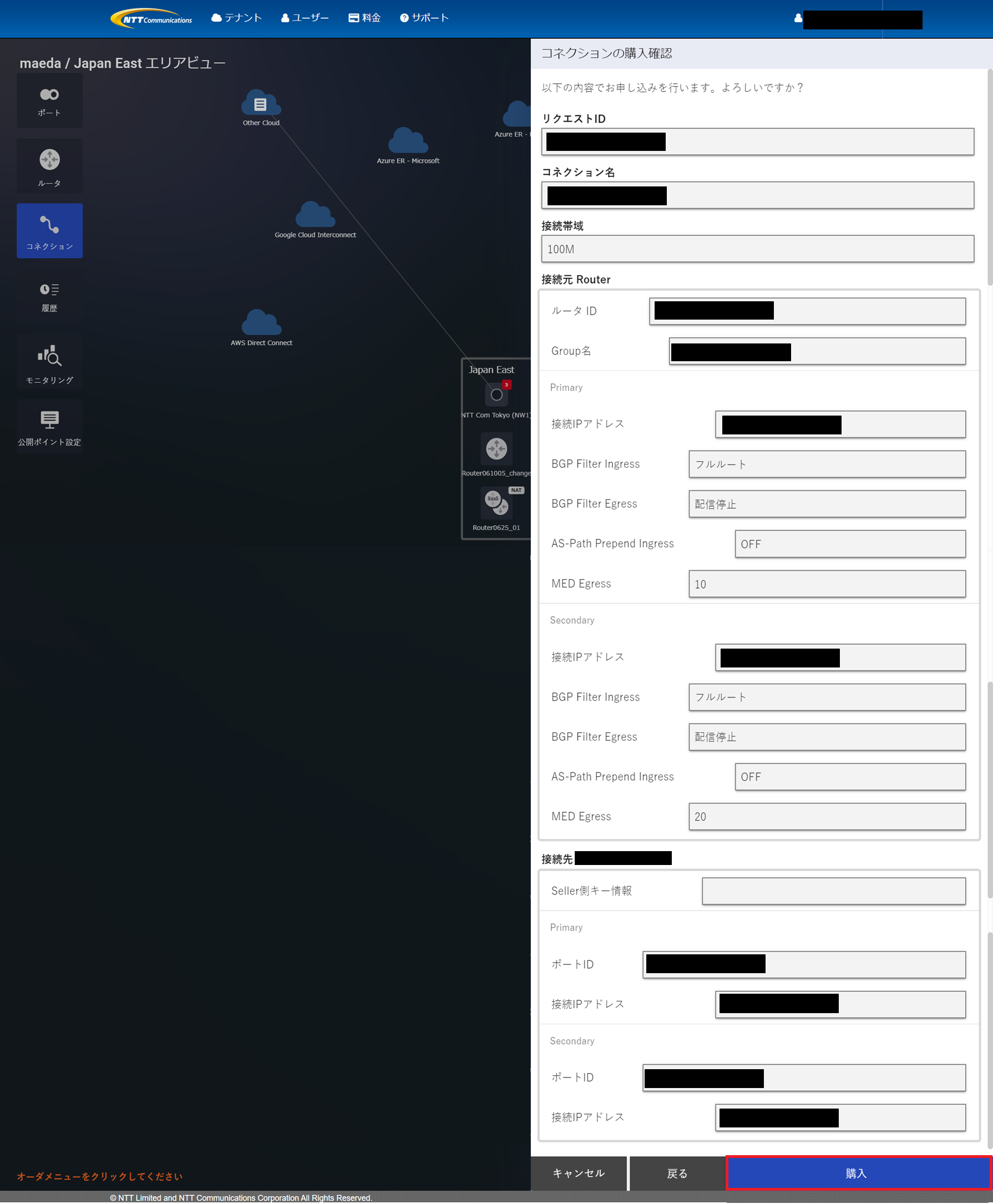 (8)コネクションの購入確認画面が表示されますので、内容を確認し「購入」を押下します。