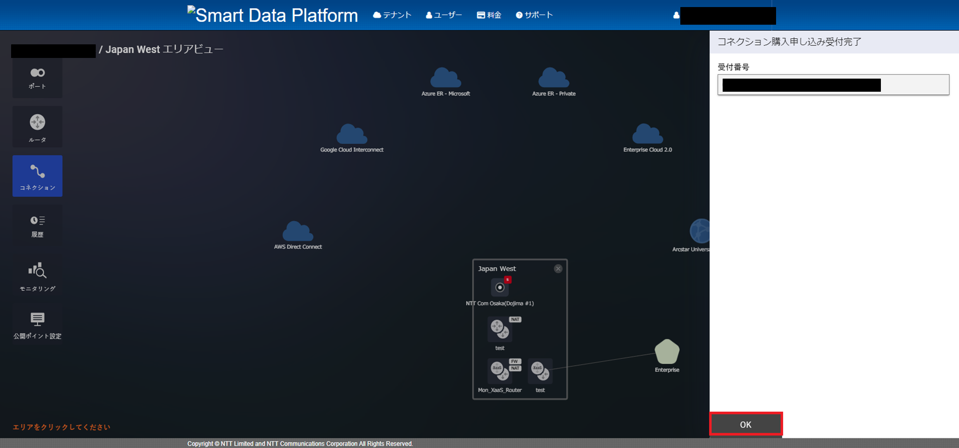 (9)コネクション購入申し込み受付完了画面が表示されますので、内容を確認し「OK」を押下します。