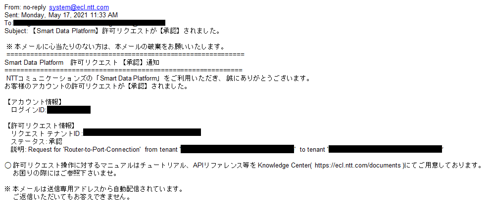 接続申請の承認は NTT Com が申請内容を確認の上、実施します。申請(=「許可リクエスト」)が承認/否認されると、申請したユーザーにメールで通知されます。(即日)