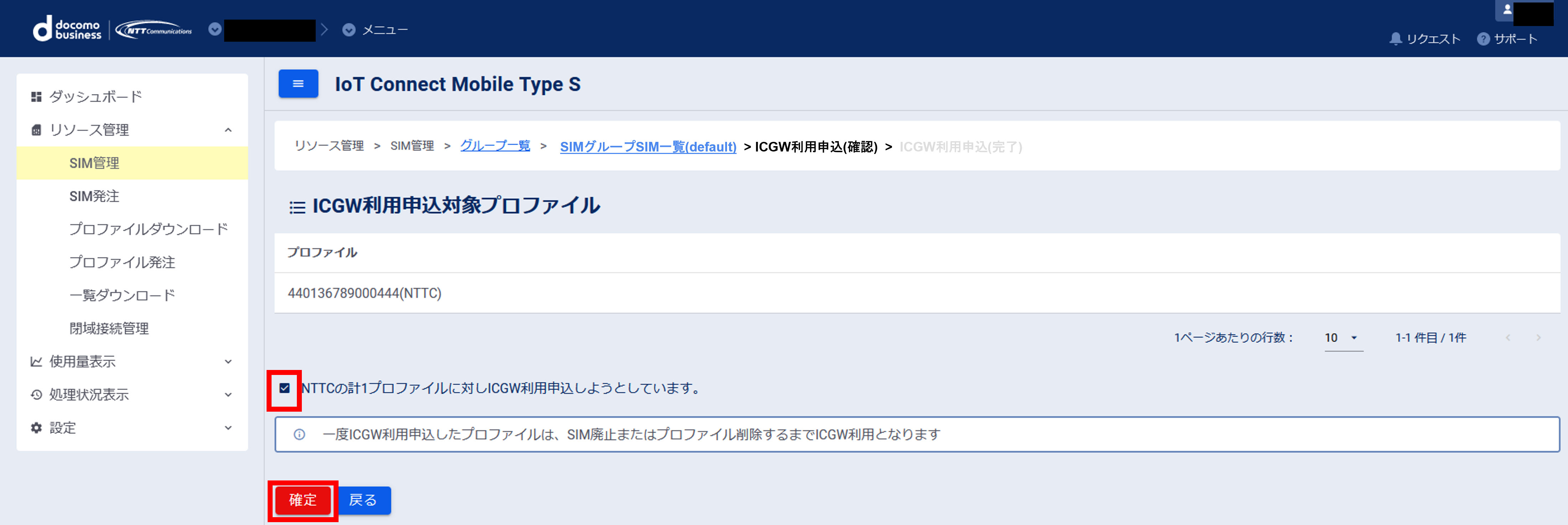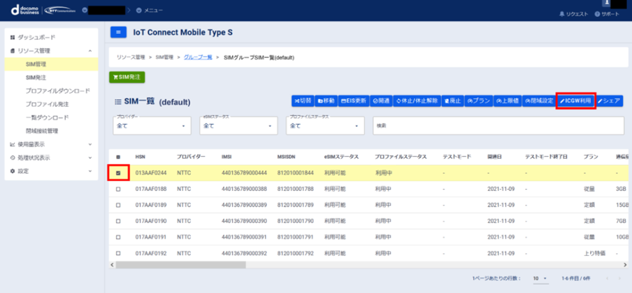 (3)該当のグループ名をクリックし、グループ一覧>SIM一覧の中からICGW利用申込したいプロファイルのチェックボックスにチェックを入れ(複数選択可)、ICGW利用申込のボタンをクリックします。TSLプロファイル、閉域接続、マルチアクセスSIMをご利用されている場合、ICGW利用の申込はできません。