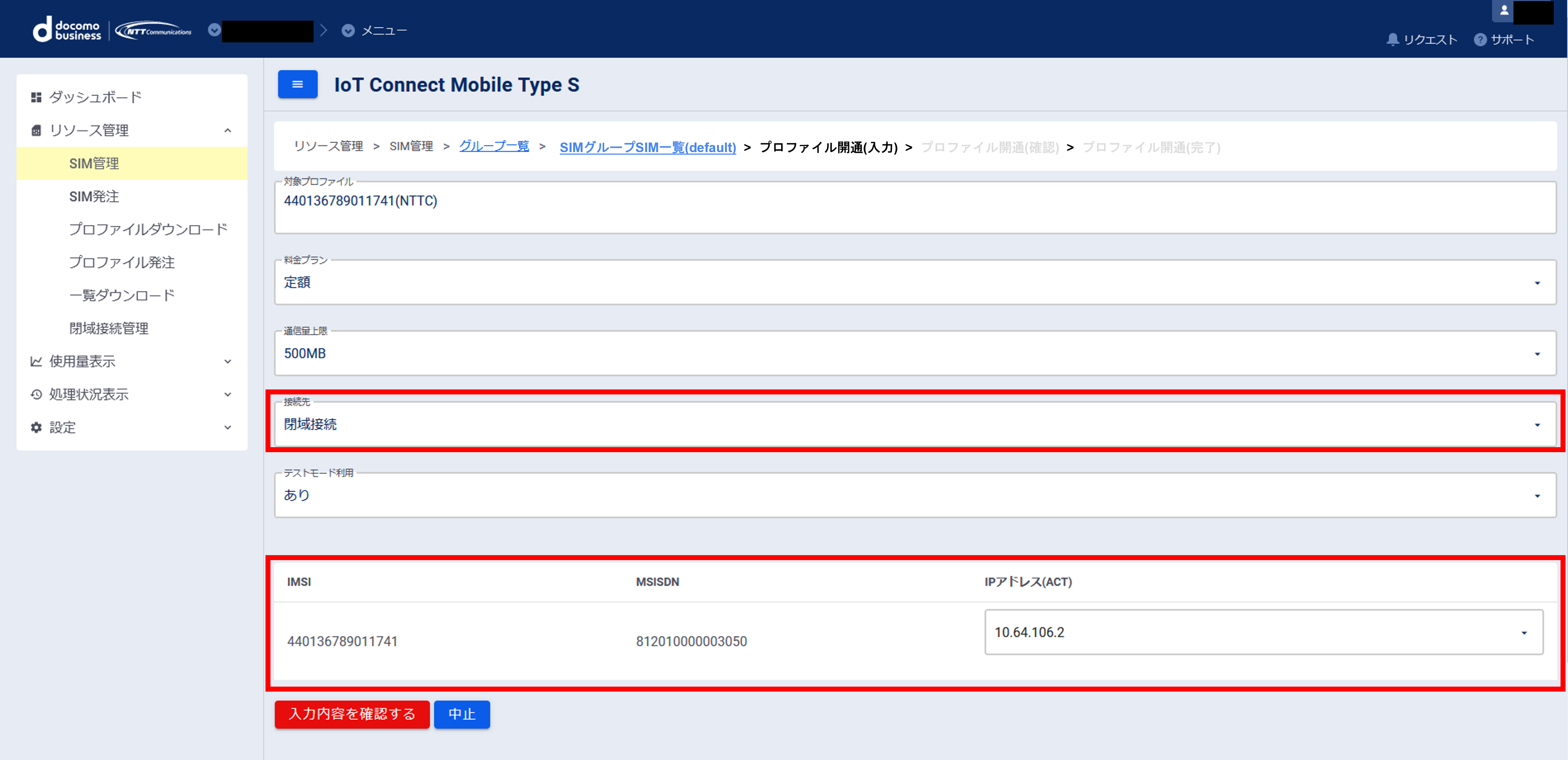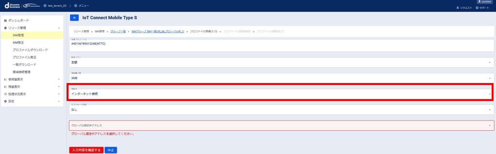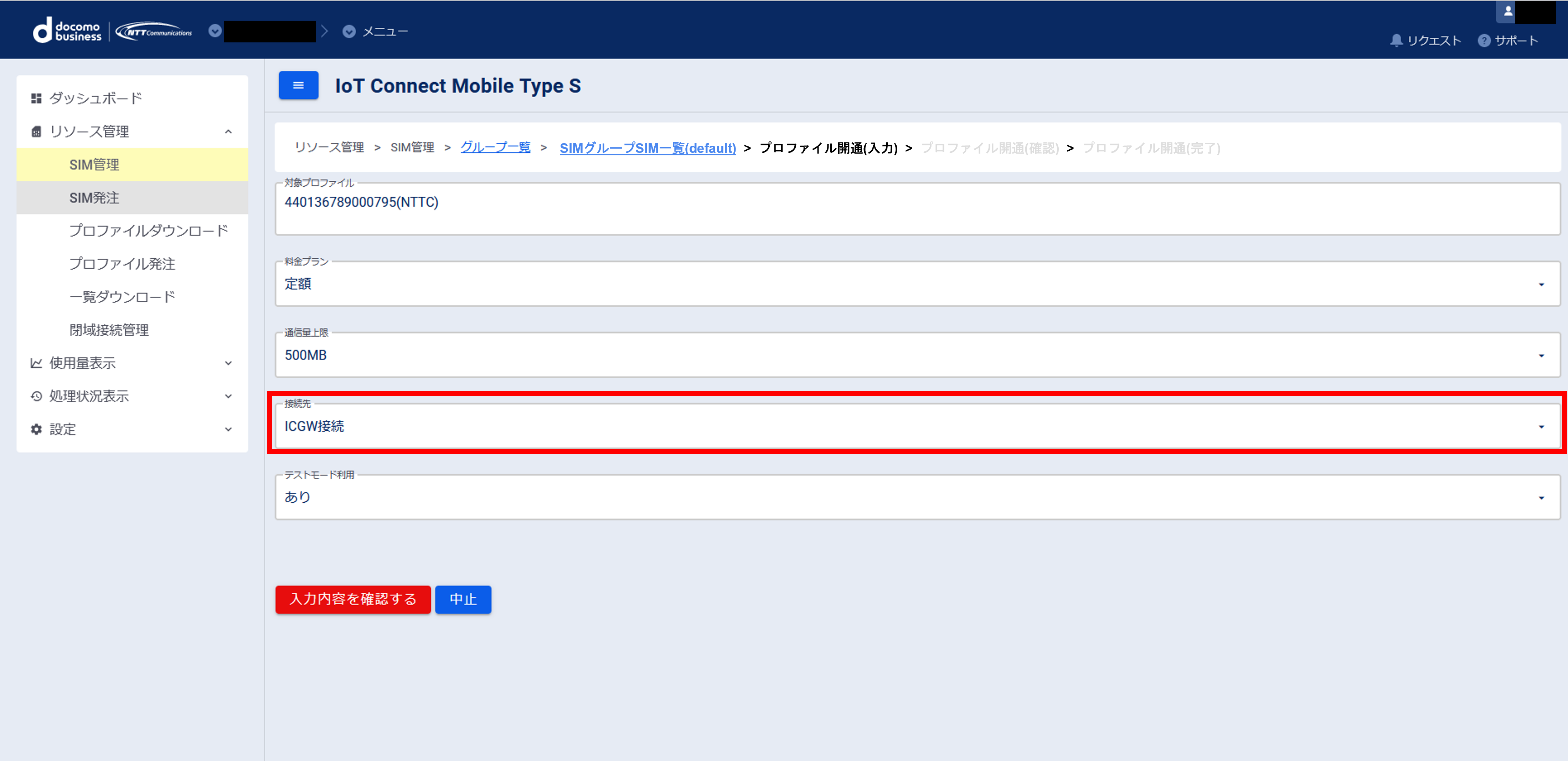 (5)該当パラメータ情報を入力して、入力完了後に「確認」をクリックするとプロファイル開通(確認)の画面に遷移します。 インターネット接続をご利用の方は「インターネット接続」を、閉域接続をご利用の方は「閉域接続」を、IoT Connect Gateway接続をご利用の方は「ICGW接続」を選択します。