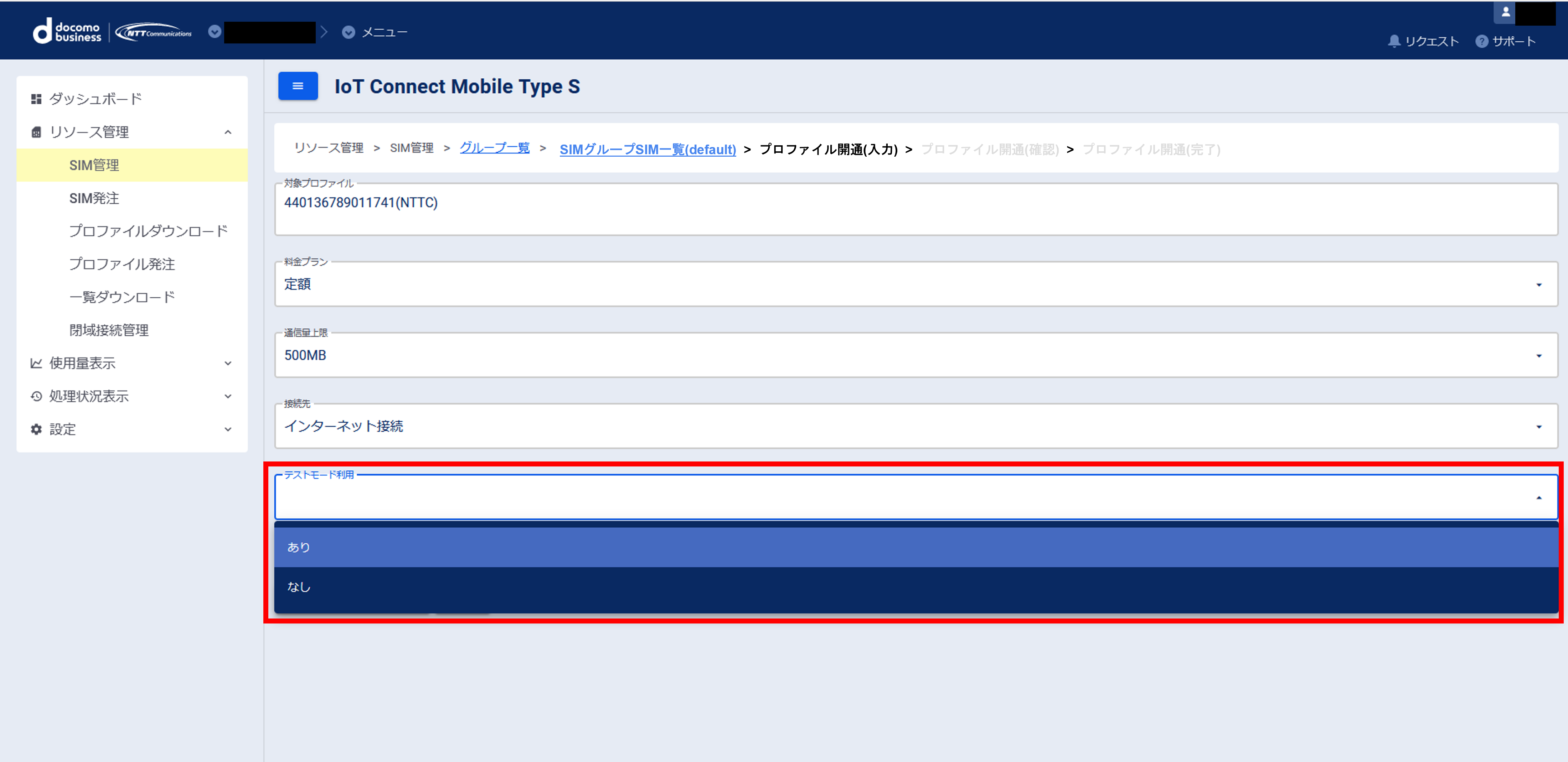マルチアクセスSIMの場合は、1つのマルチアクセスSIMに紐づく2つのプロファイルのうち、どちらを選択しても開通のボタンをクリックすると同一開通画面に遷移します。