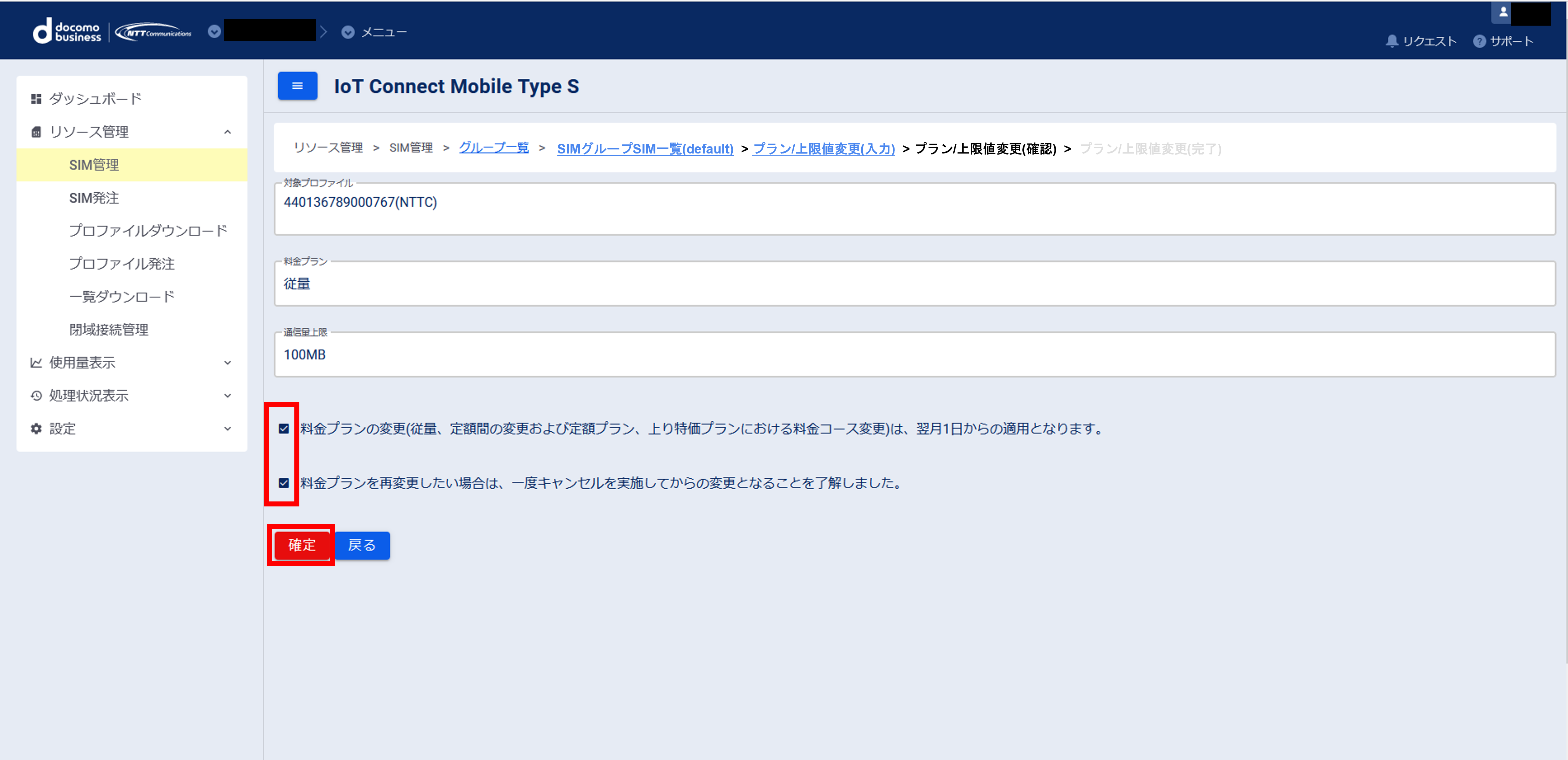 (5)該当パラメータ情報を入力して、入力完了後に「確認」をクリックするとプラン変更(確認)の画面に遷移します。