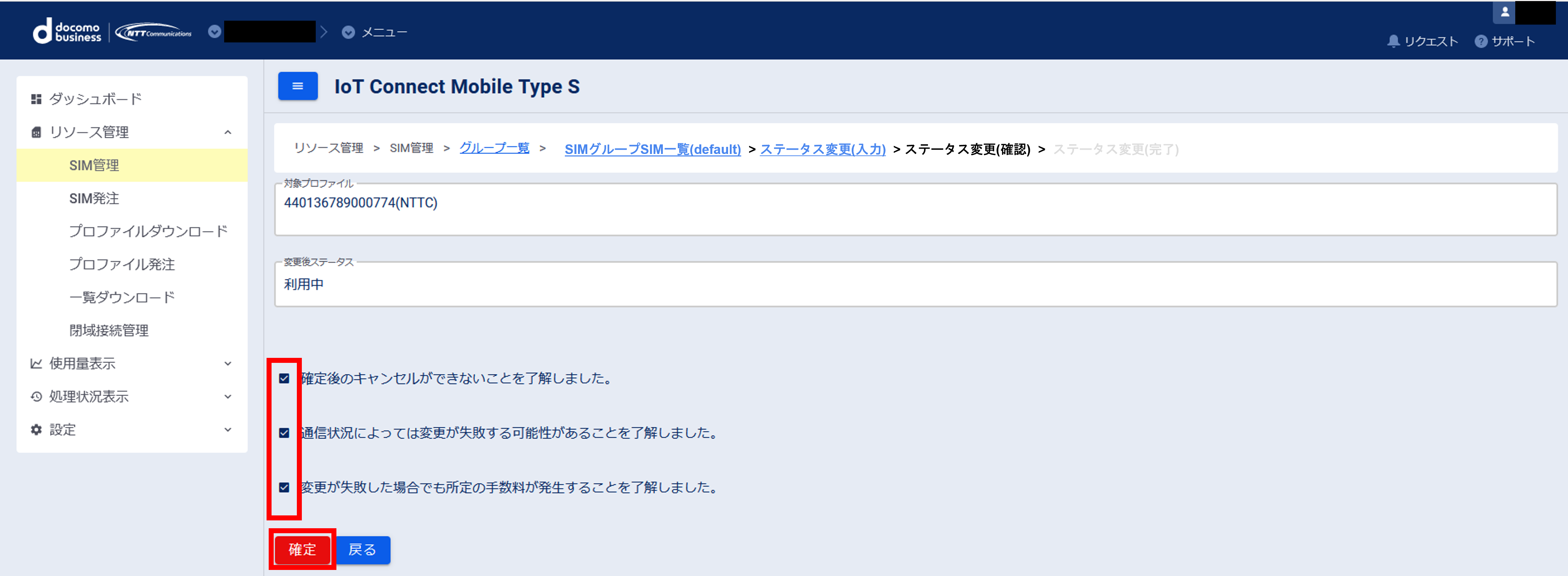 (7)チェックボックス項目の内容をご確認後、チェックを入れて「確定」をクリックするとプロファイル開通が完了します。