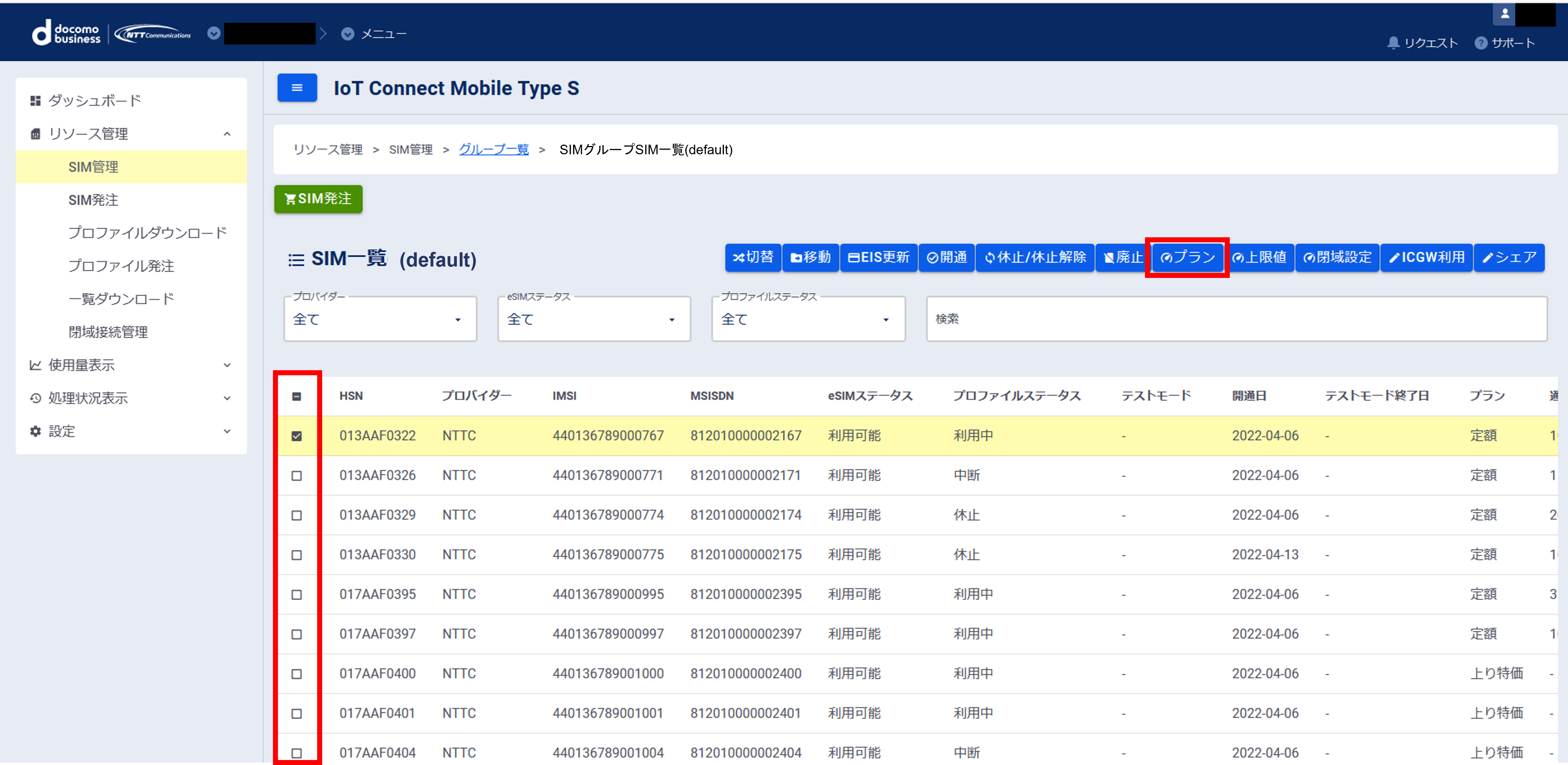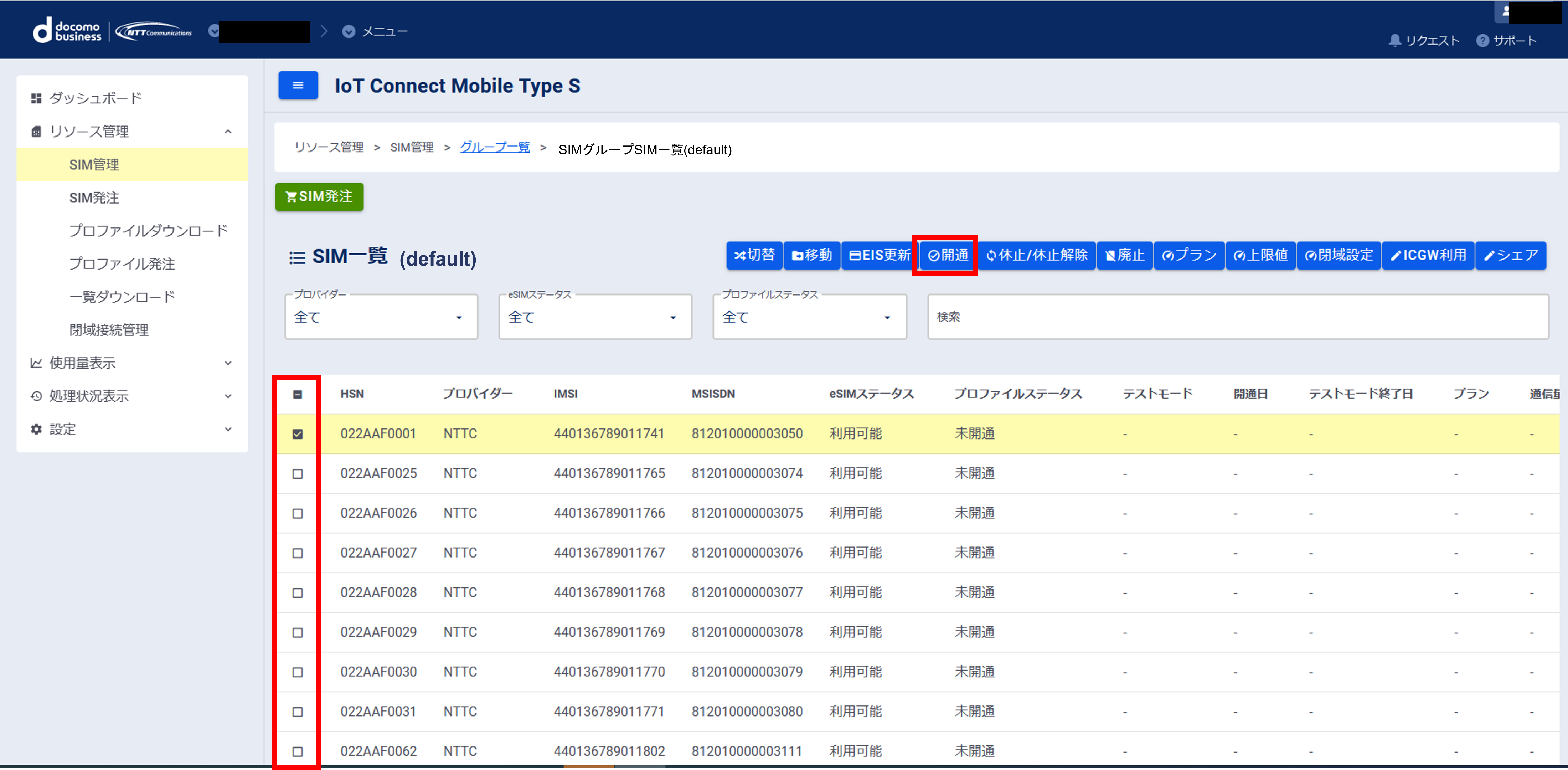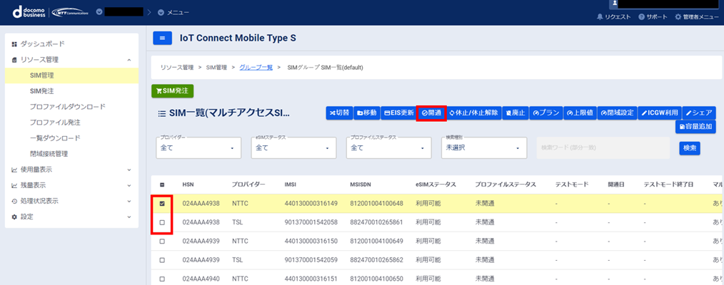 (3)該当のグループ名をクリックし、グループ一覧>SIM一覧の中から変更したいプロファイルのチェックボックスにチェックを入れ(複数選択可)、開通のボタンをクリックします。
