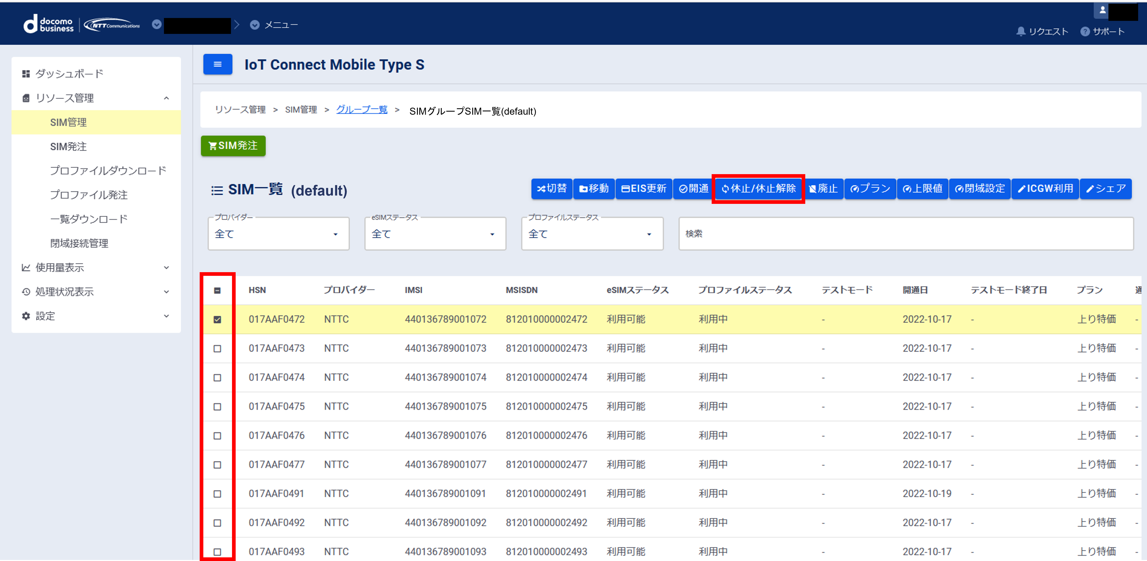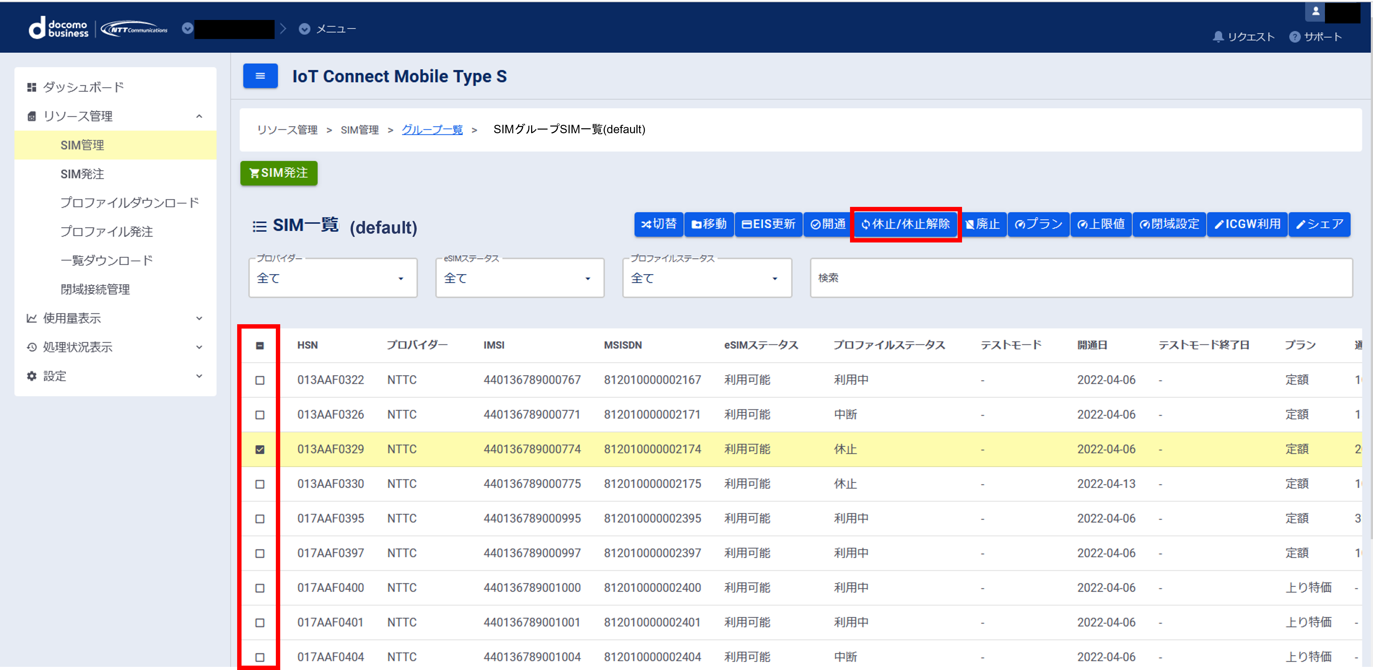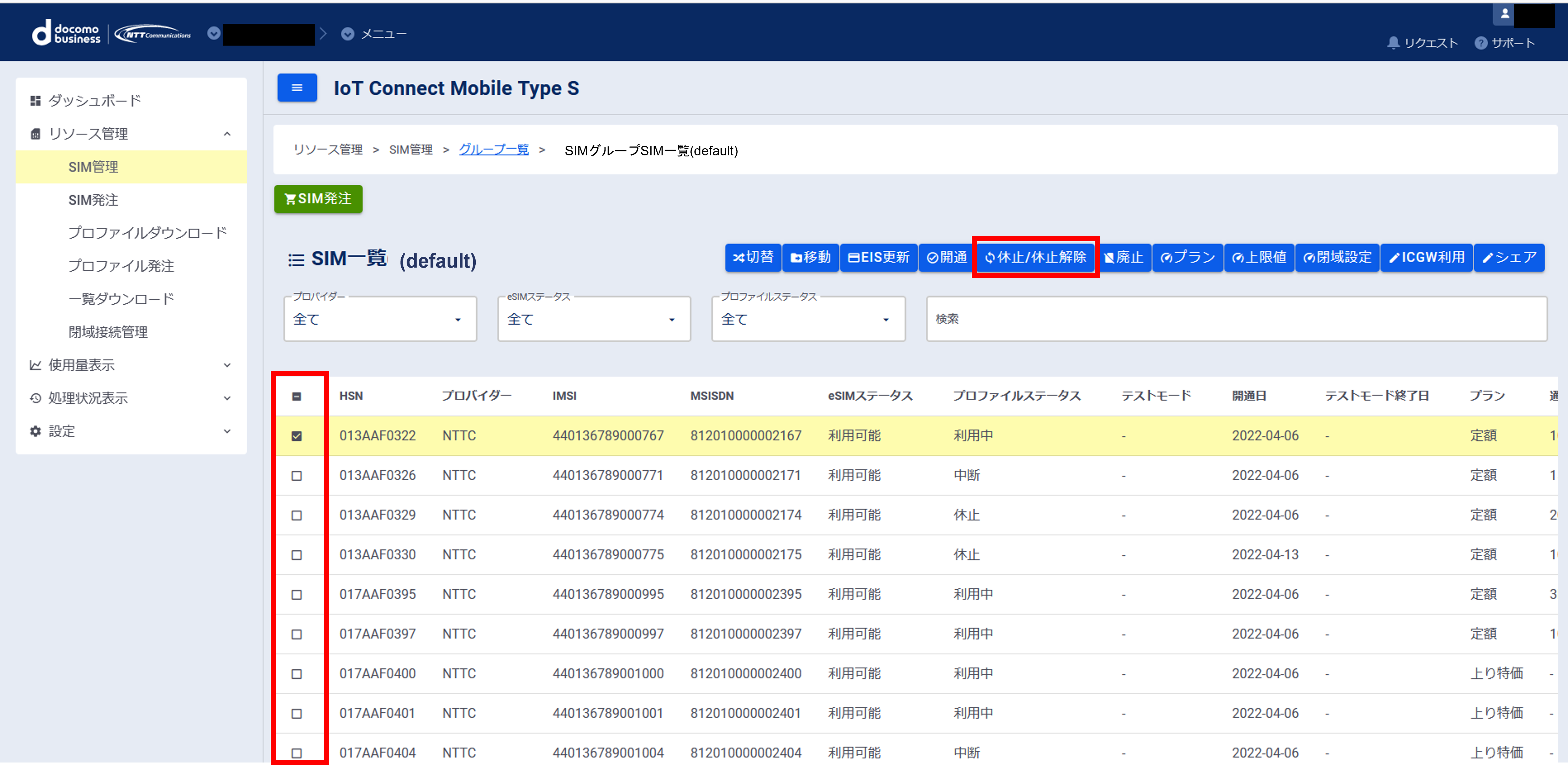 (3)該当のグループ名をクリックし、SIM一覧の中から変更したいNTTCプロファイルのチェックボックスにチェックを入れ(複数選択可)、休止/休止解除のボタンをクリックします。