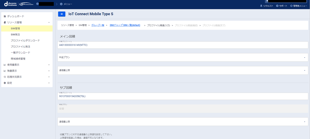 マルチアクセスSIMをご利用の場合は、同一画面から2つのプロファイル(メイン回線、サブ回線)に対し料金プランと上限値を設定いただきます。