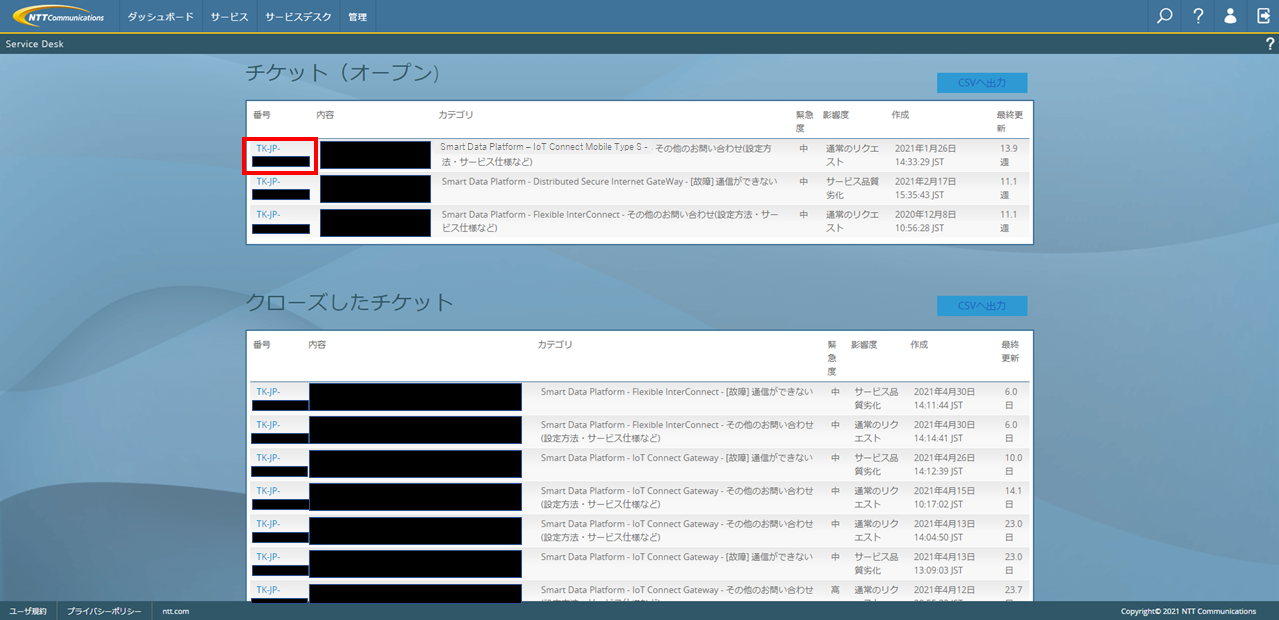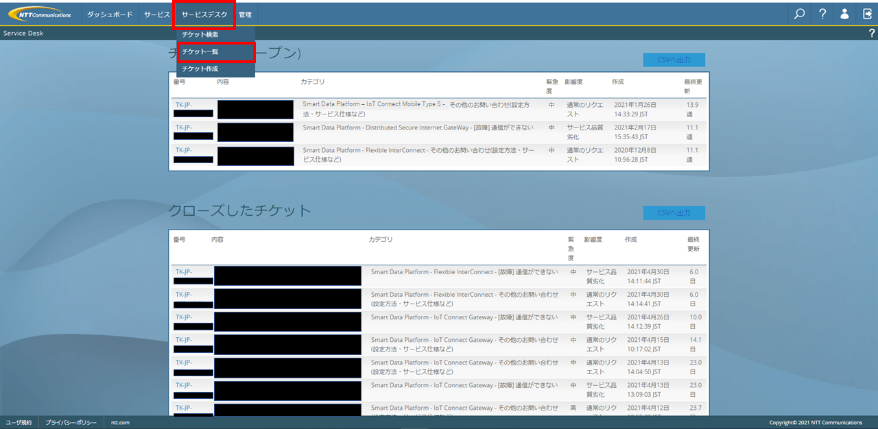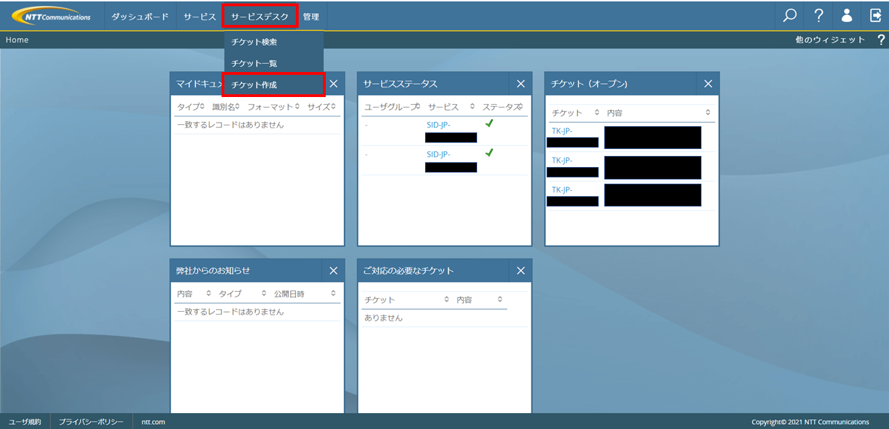 (3)「サービスデスク」を押下後、「チケット作成」を押下します。