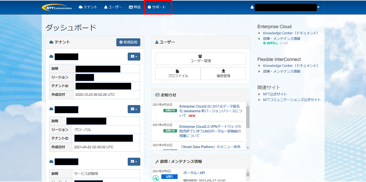 (1)Smart Data Platform(以下SDPFポータル)へログインし、「サポート」を押下します。