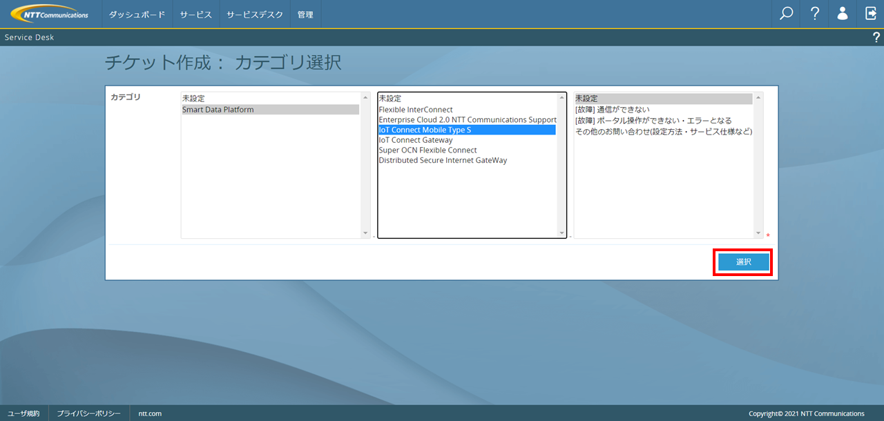 (4)カテゴリーを選択し、「選択」を押下します。 FICサービスに関するチケットを起票する場合、「Smart Data Platform」、「 IoT Connect Mobile Type S 」を選択し、お問い合わせ内容にあったチケット種別を選択してください。