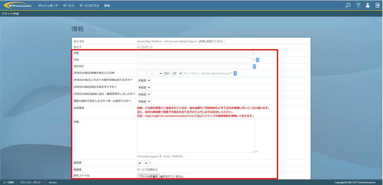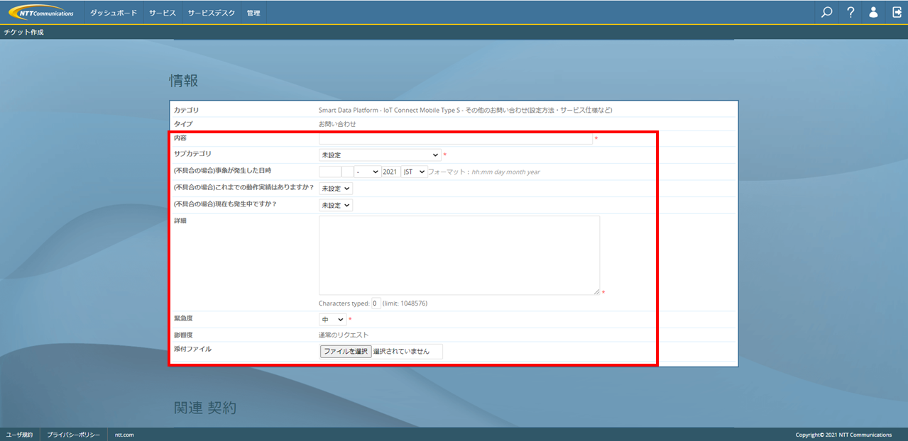 スクリーンショットやログファイルなどのファイルがある場合、チケットに添付可能です |