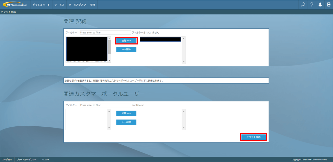 (6)必要事項を入力後、関連する契約番号およびユーザーを追加し、「チケット作成」を押下します。 契約番号およびユーザーは、左側で選択し、中央の「追加」を押下することで追加できます。