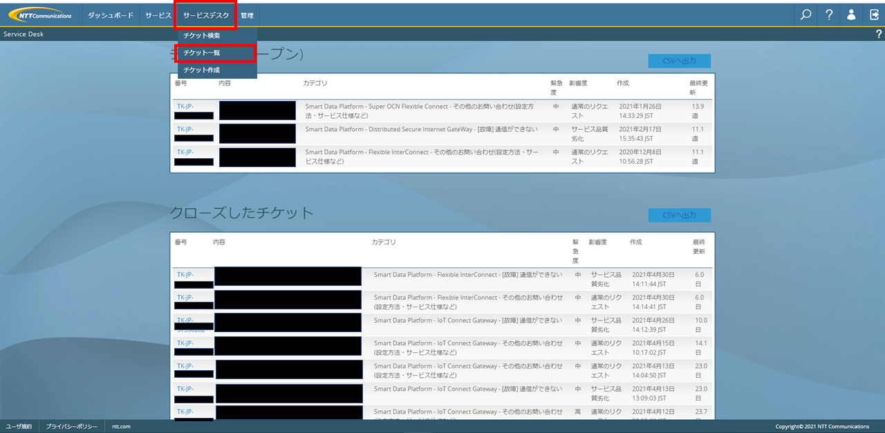 (1)「サービスデスク」を押下後、「チケット一覧」を押下します。