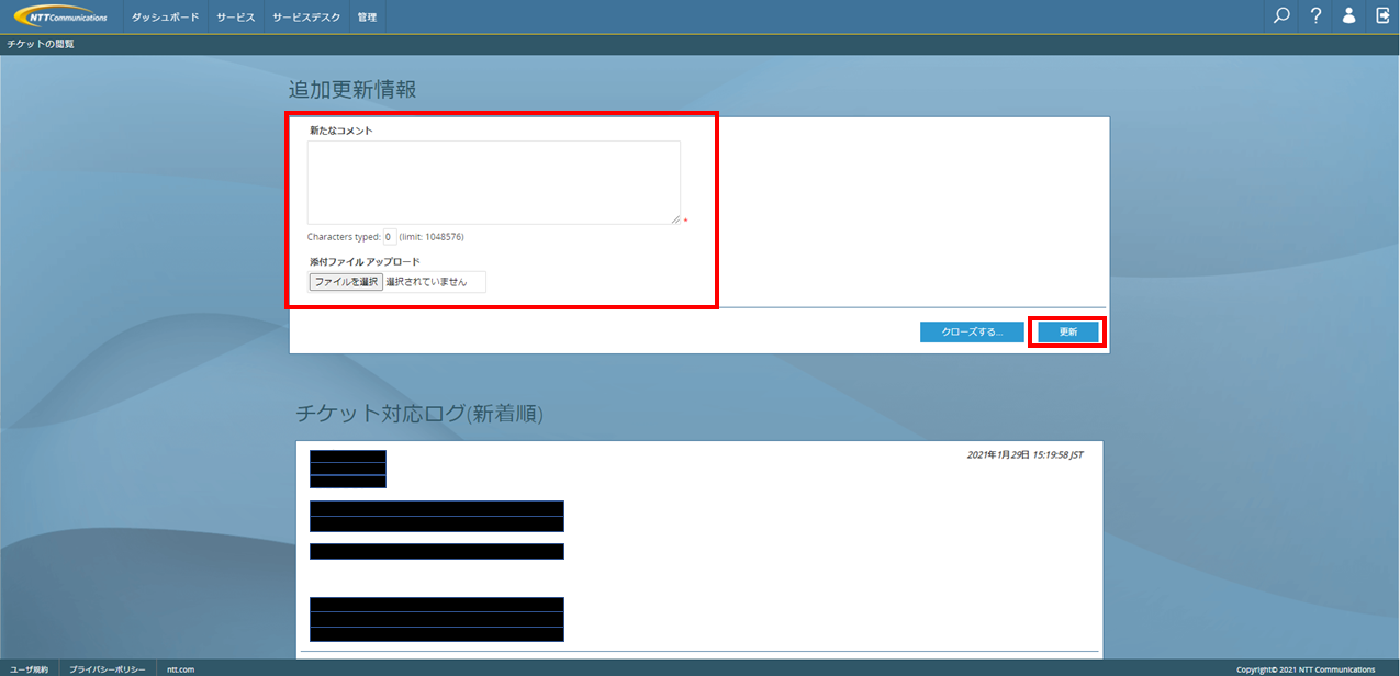 (3)追加更新情報に返信内容を入力し、「更新」を押下します。スクリーンショットやログファイルなどのファイルがある場合、チケットに添付することが可能です。