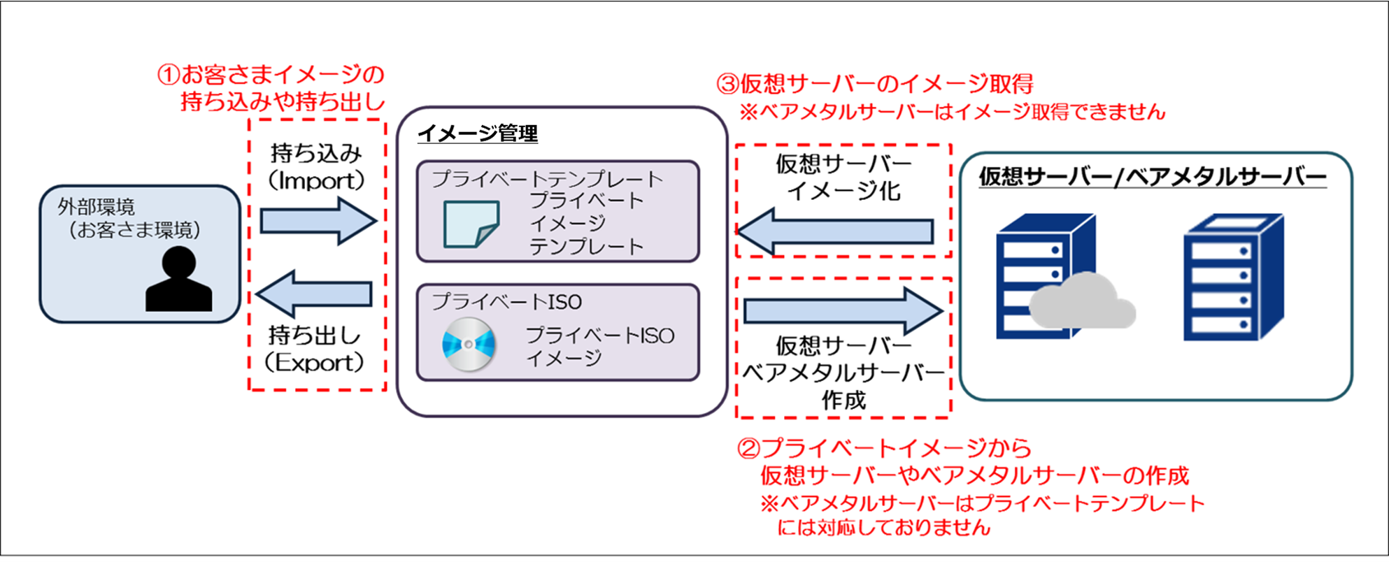 サーバーやストレージのイメージ取得および取得時の操作画面やAPIに関する故障、不具合に関してはサポート対象ですが、取得されたイメージの整合性、動作についてはサポート対象外です。