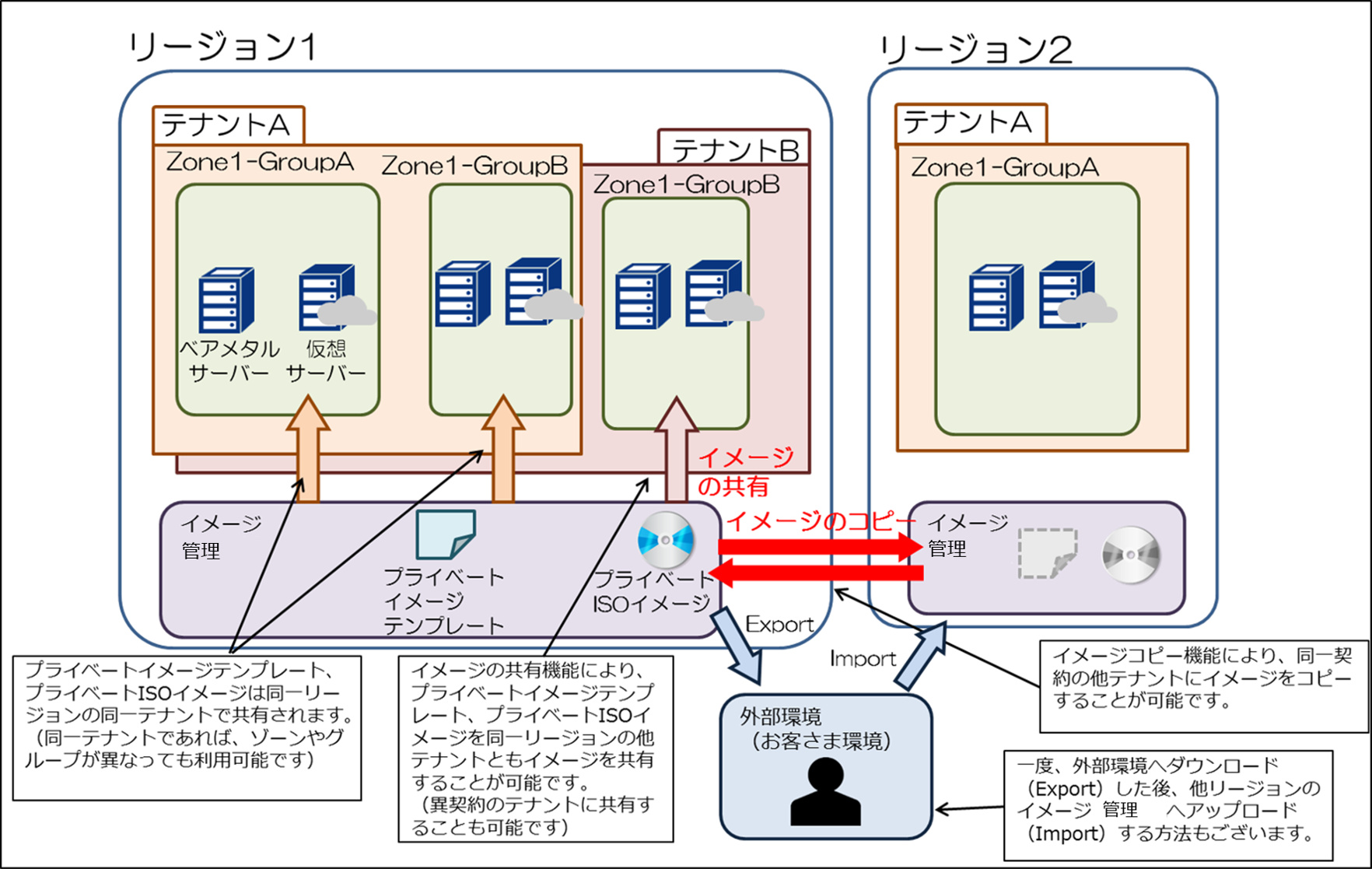 プライベートイメージテンプレートやプライベートISOイメージの登録および登録時の操作画面やAPIに関する故障、不具合に関してはサポート対象ですが、プライベートイメージテンプレートやプライベートISOイメージから起動したサーバーやストレージに関する動作についてはサポート対象外です。